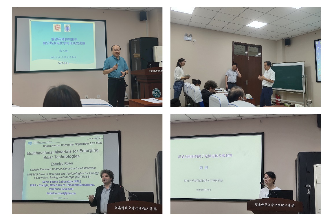 9月22日下午,应我院邀请,福州大学张久俊院士、中国科学院大连化学物理研究所陈忠伟院士、加拿大国立科学研究院Federico Rosei 院士、福州大学颜蔚教授为我校师生分别作题为“能源存储和转换中前沿热点电化学电池研发进展”、“双碳背景下的可持续发展电池技术”、“Multifunctional Materials for Emerging solar Technologies”、“异质结结构的钠离子电池负极材料”的学术报告。报告会在化学北楼N102报告厅举行,学院相关师生参加了报告会议。报告会由学院白正宇教授和北京化工大学胡传刚教授主持。