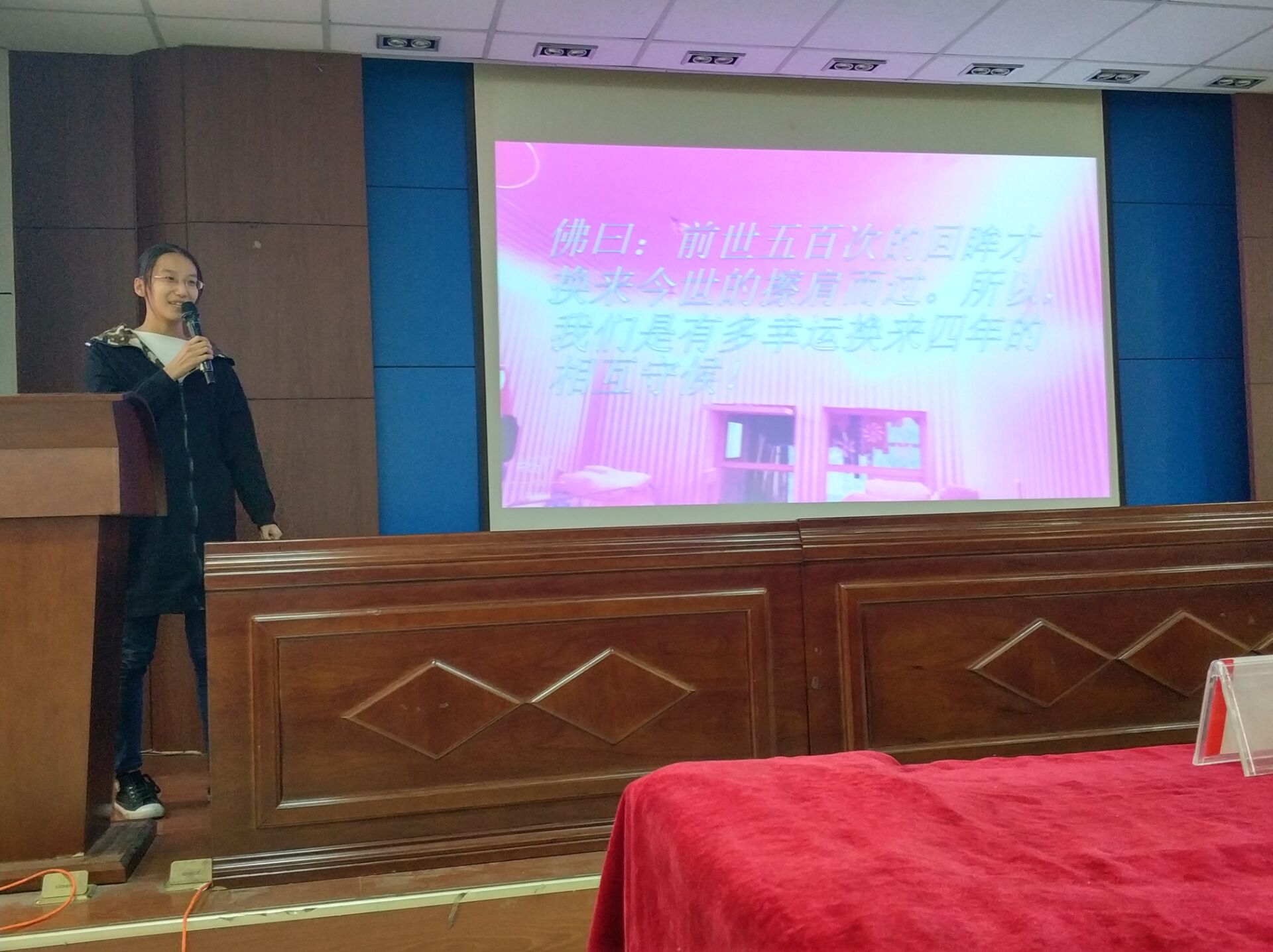 为深入学习贯彻十九大会议精神,结合“习近平新时代中国特色社会主义思想”,强化宿舍文化功能,发挥宿舍第二课堂重要性,我院于11月13日晚、11月14日中午在化学北楼五楼会议室开展“走进新时代 共创家文化”大学生宿舍文化创建大赛(预赛)。2017级全体学生参与此次活动。 活动由2016级学生干部代表担任评委。各宿舍代表依次上台,以ppt形式为评委以及同学们展示形式多样、寓意深刻的宿舍名和丰富多彩的宿舍文化。有同学说,“宿舍是我们离开父母后,另一个温暖的家,室友是我们漫漫求学路上的另一家人。”的这句话引起了同学们的共鸣。部分宿舍也准备有合唱表演、视频剪辑等各类节目。最后,文娱部部长易洪舟对本次大赛做出点评,并给2017级同学提出中肯建议。 本次“走进新时代 共创家文化”宿舍风采展大赛不仅丰富了同学们的课余生活,对进一步深化十九大精神,凝聚全院成员有深远意义。 (化学化工学院 王箫)