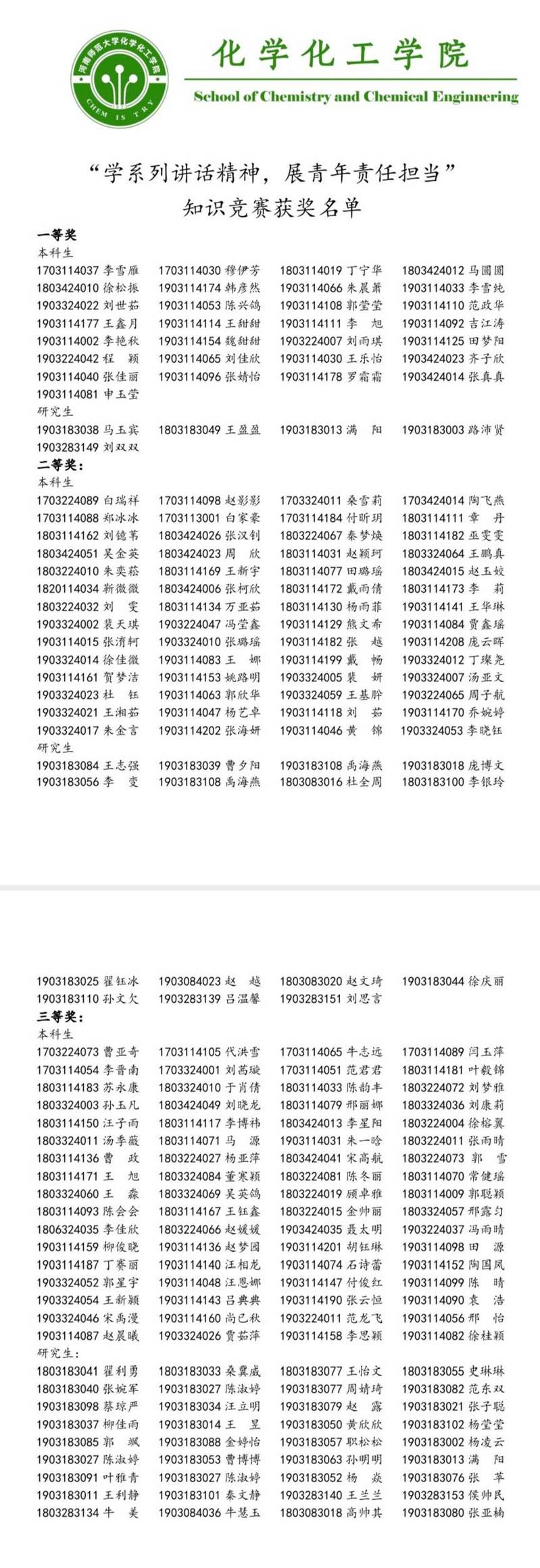 “学系列讲话精神,展青年责任担当” 知识竞赛获奖名单
