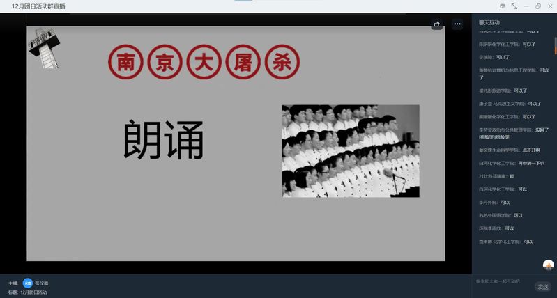 为进一步强化青年学生的爱国主义思想意识,12月4日下午,我院联合发展中心联合各挂靠社团举办以“勿忘国耻,矢志复兴”为主题的线上团日活动,各挂靠社团成员积极参与。 活动伊始,主持人致辞阐明活动背景及意义。活动期间,主持人组织观看关于南京大屠杀的视频资料,面对日本侵略者的暴行,同学们群情激愤,纷纷表示对日本侵略者的愤怒和对遇难同胞的同情。视频结束后,主持人带领同学们为逝去的同胞默哀三分钟。接着,同学们用各自的方式来表达自己对南京大屠杀死难者的深切缅怀,茗韵茶艺社的成员以茶代酒,敬慰先灵,爱心互助社的成员朗诵诗歌,呼吁青年勿忘国耻,铭记历史。最后,通过播放十九届六中全会相关视频,让同学们在回望历史的基础上,学习新时代新精神。 本次团日活动旨在让同学们回顾历史,勿忘国耻,树立远大革命理想和崇高人生信念,同时学习感悟十九届六中全会精神,教育广大青年学生不断增强社会责任感和使命感。 (化学化工学院 王怡丹 罗子萌) |
