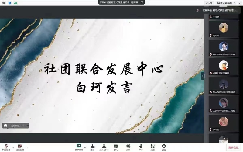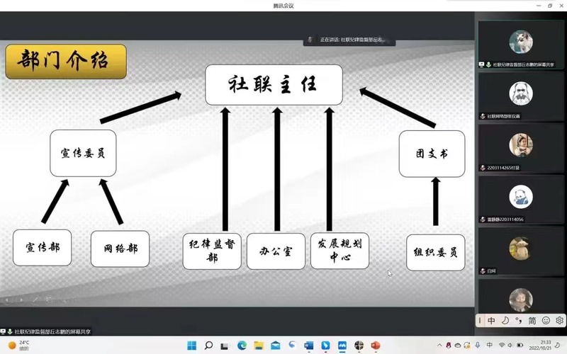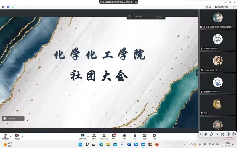 为提高学院社团的能力,增强社团活动质量,10月21日晚,我院社团联合发展中心于腾讯会议线上平台举办了社团工作交流会。院社团联合发展中心全体成员及各社团成员参加本次会议。 会上,社联各部门负责人以PPT的形式对其部门工作职能和注意事项进行了介绍,尤其强调了活动申请表的格式、内容和上交时间以及活动宣传中新闻稿和官Q运营的时效性和语言的严谨性。随后,宣传委员刘魏进行补充说明,强调了新闻用语要严谨,图片要标明其来源。最后,社联主任白珂进行发言,就社团联合发展中心各成员的工作态度和社团活动的创新性两方面进行着重强调,她提出社联成员要全面了解各部门工作职能和工作方法,同时对自身工作及时进行总结和反思,以便更好地服务社团。至此,社团大会圆满结束。 本次会议的顺利召开,加强了社团和社联的紧密联系,提高了各社团干事处理社团相关问题的效率,为社联的管理和发展奠定了良好的基础。 (化学化工学院 周璟 王思嘉)