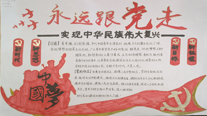 化学化工学院爱心互助社举办主题团日活动 为献礼党的二十大,庆祝其胜利召开,同时激励社员奋发向上,努力拼搏,尽显青春活力,逐梦前行,10月22日下午,化学化工学院爱心互助社在腾讯会议举办主题团日活动,爱心互助社全体社员参加。 活动伊始,主持人通过视频展示了中国共产党近百年来的伟大成就及历史意义,并带领大家学习百年来积累的宝贵经验,社员们重温党史,从伟大建党精神中学习中国共产党的革命精神、首创精神、奋斗精神、奉献精神等。接着,社长鼓励同学们全面了解党的全国代表大会,他从大会召开时间、内容及历代党会信息等方面向社员们介绍党的二十大召开的重要意义,帮助同学们更好地了解党代会,大家纷纷表示受益匪浅。之后,主持人采用知识问答的方式帮助同学们学习了中国共产党的相关知识,大家踊跃参与,展现个人风采。最后,主持人以师范大学“我们都是追梦人”歌曲为结尾,以党的二十大报告中十年来的新成就,引导同学们绽放青春色彩,书写青春华章。 本次团日活动通过多种方式为大家传输有关中国共产党及党的二十大相关知识,社员们积极参与,受益匪浅。这个伟大的时代,是我们青年的机遇和挑战,唯有坚持“永久奋斗”的信念,才可以奋发向上,砥砺向前。 (化学化工学院 王怡倩) 汲取精神内涵,厚植人生底蕴 ——爱心互助社线上学习党的二十大精神 时值中国共产党第二十次全国代表大会召开之际,为学习党的二十大精神,凝聚思想力量,10月21日至23日,化学化工学院爱心互助社举办了“学习党的二十大,同心同向跟党走”线上主题活动。 活动前期,爱心互助社通过官Q进行活动宣传,吸引同学们积极报名参加。活动期间,同学们以手抄报、PPT、影视剪辑等多种方式提交活动作品,形式多样的作品中饱含着其对党的二十大胜利召开的庆祝,以及对伟大建党精神的赞美。其中不乏一些优秀作品,书法作品游云惊龙,笔力苍劲,一撇一捺间书写出盛世中华;手抄报作品栩栩如生,方寸间浓缩党的历史征程;演讲作品中,同学们激情致辞,以文字为载体表达了自己对党和祖国的崇敬和热爱。最后,工作人员评选出优秀作品,至此,本次活动圆满结束。 此次活动为同学们搭建了一个交流互动、展示自我的平台,使同学们在切身实践的过程中学习感悟党的二十大精神,同时也提高了其艺术欣赏能力与口语表达能力。 (化学化工学院 李梦奇 郭家乐) 学习党的二十大,坚定信念跟党走 为积极响应党的方针政策,深入学习党的思想,传承党的二十大精神,10月23日下午,化学化工学院青年志愿社于腾讯会议线上平台开展了“学习党的二十大,坚定信念跟党走”团日活动。 活动伊始,主持人通过播放一段党的二十大的视频引出本次活动主题——学习党的二十大,坚定信念跟党走。接着,主持人借助PPT对党的二十大的内容进行了简单介绍,并对党的二十大的会议精神进行了概括总结,同时呼吁社员们自觉学习贯彻党的二十大精神。随后,主持人播放党史及党的二十大相关视频,使社员们实时了解党的二十大。在此过程中,社员们认真观看视频,了解党的二十大的新论断。最后,社员们自主发言,表达自己对此次活动的理解和感悟。 本次活动的顺利召开,不仅加深了社员们对党的二十大精神的理解,还增加了其对党和国家的崇敬和热爱之情,同时呼吁广大青年不忘初心,砥砺前行,为实现中华民族伟大复兴尽一份力! (化学化工学院 马秋爽 王思嘉) 化学化工学院学研会举办“学习党的二十大,擎旗奋进新时代”主题活动 为学习党的二十大精神,进一步落实立德树人的工作,引领学生坚定信念跟党走,以实际行动庆祝党的二十大胜利召开,化学化工学院学研会于10月20日至23日通过腾讯会议举办 “学习党的二十大,擎旗奋进新时代”的线上主题活动。 本次活动以手抄报或海报的形式开展。活动前期,社团工作人员通过官方QQ进行活动宣传,学生们踊跃参加活动。活动过程中,参赛选手严格按照活动主题进行独立创作,发挥自己的想象能力,将对党的祝福写在纸上,亦或是将其以绘画的形式呈现,深刻表达自己的爱国精神。其中2022级本科生梁秋雨的作品色彩靓丽,构图简洁大气,栩栩如生,给人留下深刻的印象;2022级本科生段淼的作品以日报的形式表达对党的祝福,形式新颖,令人眼前一新。在手抄报和海报的制作方面,学生们发挥了天马行空的想象力,使得版面设计、字体选择和绘画功底,都别具一格。至此,本次活动圆满结束。 道阻且长,行则将至,行而不辍,未来可期。此次活动的圆满举办,不仅给学生们提供了一个施展绘图技术、表达设计思想的平台,还提高了学生们的艺术审美能力与动手能力,让学生们在绘出党的百年奋斗征程以及中国巨大发展变化的过程中表达对党和祖国的美好祝愿。 (化学化工学院 王昭懿 刘倩倩) |