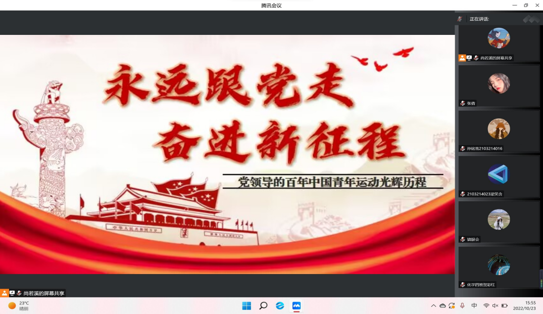 为学习贯彻党的二十大精神,团结带领广大青年成为有理想、敢担当、能吃苦、肯奋斗的新时代好青年,10月30日,我院大学生环保协会于腾讯会议线上平台开展了“永远跟党走,奋进新征程”团日活动。此次会议由团支部部长尚若溪主持。 活动伊始,主持人宣读开场词,讲述了此次团日活动的主题背景,带领社员重温入团誓词,奏唱团歌。接着,主持人以中国共产党领导青年运动的光辉历程为切入点,向社员们介绍了不同时期的青年运动史,并邀请社员分享自己曾经打卡过的红色基地,这使他们对党的百年奋斗史有了更深刻的认识和了解。随后,主持人通过视频的形式向大家着重介绍了习近平总书记在党的二十大开幕会上对青年的殷切寄语,社员们也积极分享了此次的学习心得和感悟。最后,主持人对本次活动进行总结发言,强调新时代广大青年应牢记使命,砥砺前行。 此次团日活动的顺利开展,有利于增强社员的集体荣誉感和参与感,进一步感受中国共产党一路走来领导我们筚路蓝缕的艰辛以及如今美好幸福生活的来之不易。 (化学化工学院 尚若溪 王思嘉)