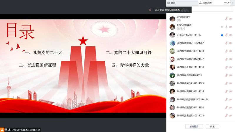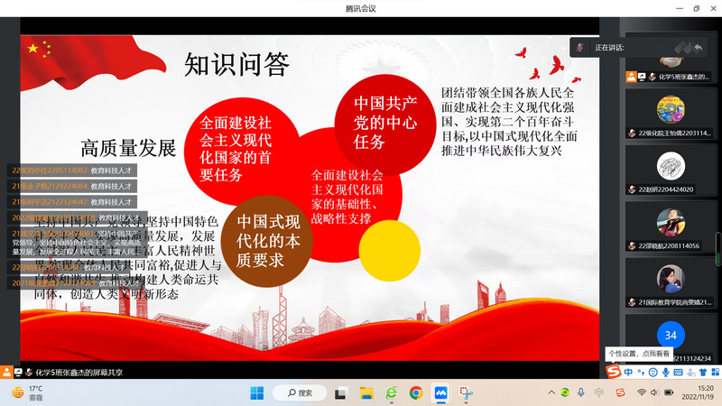 青春飞扬,强国有我。11月19日下午,我院爱心互助社于腾讯会议线上平台开展了“强国有我新征程,砥砺奋进致青春”团日活动。此次会议由2022级本科生张鑫杰主持,爱心互助社全体成员参会。 本次活动分为“礼赞党的二十大”、“党的二十大知识问答”、“奋进强国新征程”及“青年榜样的力量”四个部分。活动伊始,主持人对党的二十大内容进行了总结,随后从不同维度剖析了党的二十大的现实意义、时代意义及历史意义。在知识问答环节,社员们积极参与分享党的二十大相关知识。接着,主持人带领社员们学习了党的二十大精神,并通过视频回望中国近五年和十年来的非凡成绩,一幕幕画面,无一不牵动着社员们的家国情怀。最后主持人讲述了以陈祥榕、苏翊鸣和孙颖莎等为代表的优秀青年的事迹,再次呈现了习近平总书记对青年一代寄予的深切厚望,并表示青年更应当砥砺奋进,绽放青春之花,矢志不渝地坚持中国共产党的领导。 本次线上活动旨在从青年优秀事迹出发,以青春礼赞党的二十大,激励学生们砥砺奋斗,用自身行动为祖国发展添砖加瓦。这次活动不仅鼓励学生要追逐理想,以优秀青年为学习目标,追求卓越、全面发展,而且要涵养爱国情怀为党和国家事业发展贡献自身的智慧和力量。 (化学化工学院 王怡倩 王思嘉)