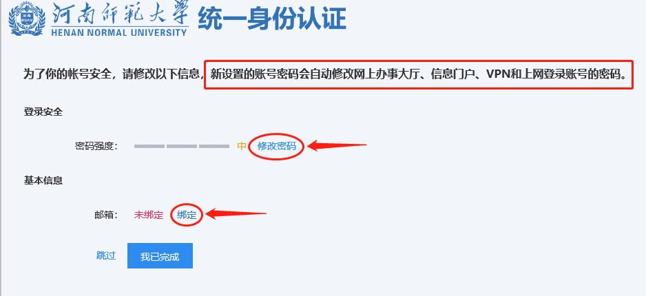 3、请务必按照下图所示修改密码和绑定邮箱(建议绑定qq、163等校外邮箱,以便于忘记密码时用此邮箱找回密码)。