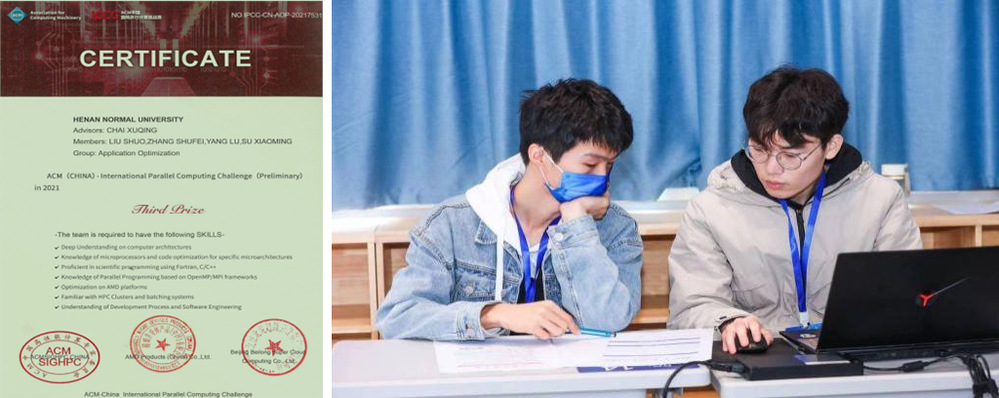 3.IPCC ACM中国-国际并行计算挑战赛(ACM-China lPCC):由ACM中国指导,ACM中国高性能计算专家委员会、AMD(中国)联合主办,北京超级云计算中心承办。每年暑期举行,赛题内容涉及到数学、物理等方面的源代码优化,比赛平台基于AMD的处理器,不限优化方法与手段。2021年我校计算机与信息技术学院本科生张术飞带领的队伍在竞赛中取得三等奖,2022年我校软件学院本科生韩秉豫、计算机与信息技术学院本科生张术飞带队获得二等奖。