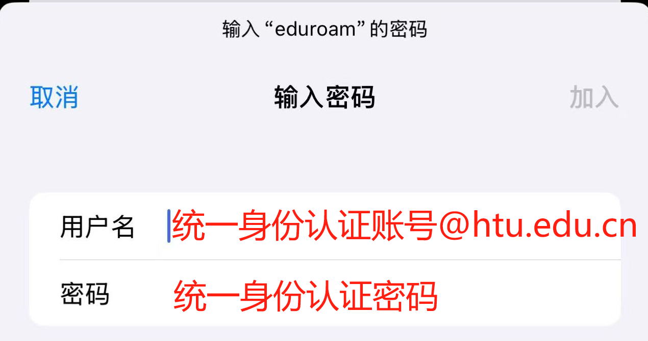 2. 出现认证界面后,输入统一身份认证账号,我校师生账号名为学/工号再加后缀“@htu.edu.cn”,如学/工号为:123456, 则eduroam接入用户名为:123456@htu.edu.cn,密码为统一身份认证密码。点击“加入”可接入被访学校的网络。