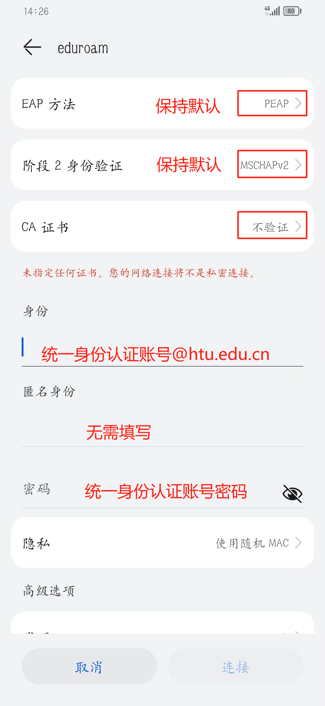 2.“EAP方法”和“阶段2身份认证”栏目保持默认设置,“CA证书”栏目选择“不验证”,“身份”栏目输入统一身份认证账号,我校师生账号名为学/工号再加后缀“@htu.edu.cn”,如学/工号为:123456, 则eduroam接入账号名为:123456@htu.edu.cn, “匿名身份”无需填写,“密码”为统一身份认证密码。点击“连接”可接入被访学校的网络。