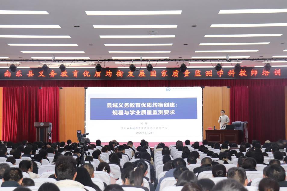2月23日下午,南乐县教育局邀请河南省基础教育发展监测与评价中心监测实施部主任刘锦一行,赴濮阳市南乐县开展以“县域义务教育优质均衡创建:规程与学业质量监测要求”为主题的培训。局长管瑞丰带领领导班子成员、小学和初中校长及学科教师代表共计500余人参加了此次培训。培训会由副局长苗向阳主持。