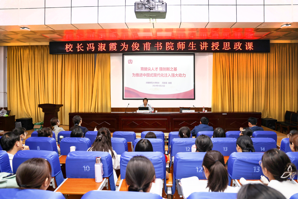 4月25日晚,校党委副书记、校长冯淑霞在党校教室为俊甫书院师生讲授思政课。俊甫书院全体师生现场聆听。