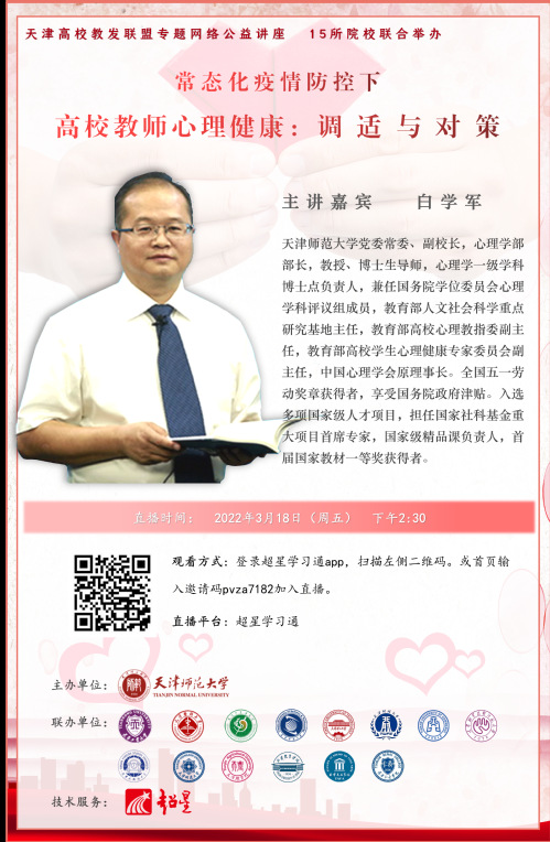 专家介绍:白学军,天津师范大学党委党委、副校长,心理学部部长,教授、博士生导师,心理学一级学科博士点负责人,兼任国务院学位委员会心理学学科评议组成员,教育部高校心理教指委副主任,教育部高校学生心理健康专家委员会副主任,中国心理学会原理事长。全国五一劳动奖章获得者,享受国务院政府津贴。入选多项国家级人才项目,担任国家社科基金重大项目首席专家,国家级精品课负责人,首届国家教材一等奖获得者。