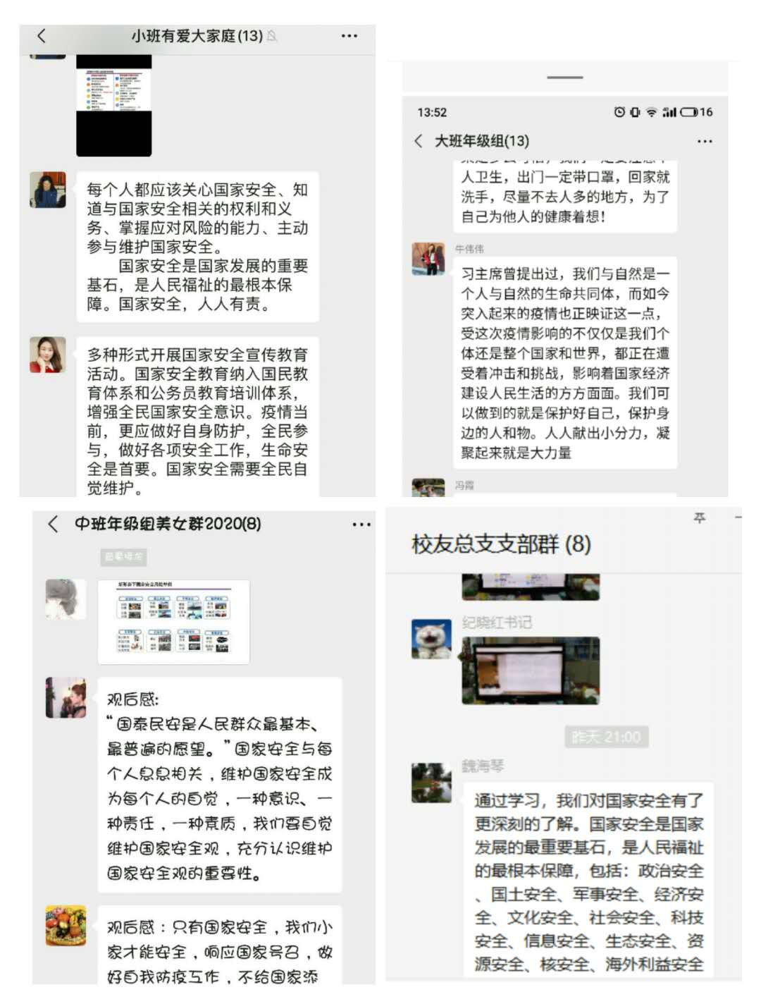 为深入学习贯彻习近平新时代中国特色社会主义思想,着力防范化解重大风险,切实增强广大师生的忧患意识和底线思维,提高大家抵御各类国家安全风险的能力,形成和汇聚维护国家安全的强大力量,机关一总支按照学校部署,于4月14日第5个全民国家安全教育日来临之际,以支部为单位在线组织开展了“同上一堂国家安全教育课”活动,广大教职工围绕“坚持总体国家安全观,统筹传统安全和非传统安全,为决胜全面建成小康社会提供坚强保障”主题,通过线上平台收看2020年全民国家安全教育日高校公共课并进行了充分心得交流,收到了预期的效果。