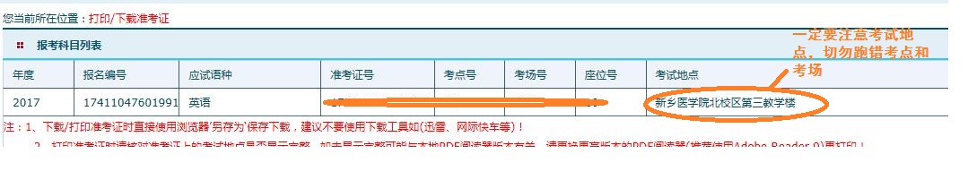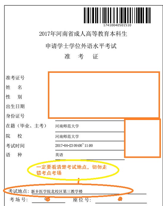 重要提示:2017年4月成人学士学位外语水平考试的考场编排由新乡市招生办公室采用计算机程序随机编排,考试地点不一定在现场确认学校,请各考生认真查看自己的考试地点、考场号、座次号等信息。携带考试相关物品,提前到达考试地点。