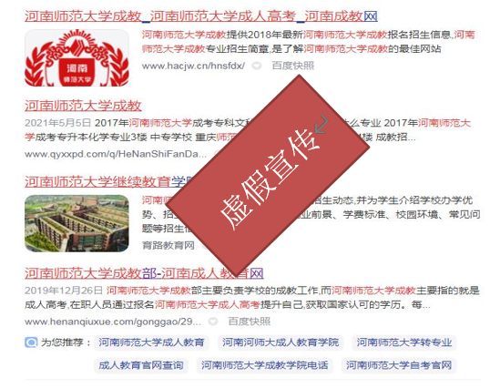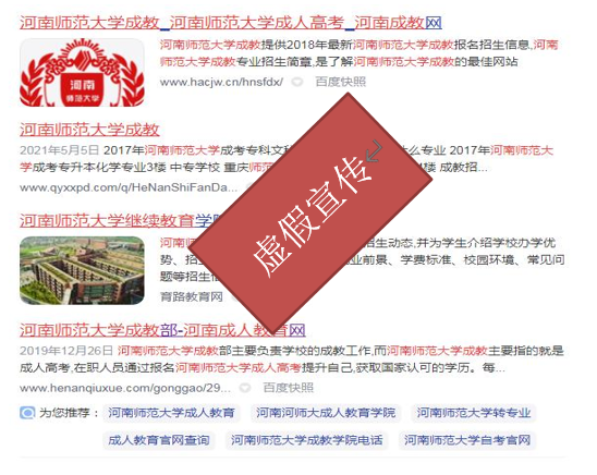 近日,河南师范大学继续教育学院发现部分社会培训机构冒用我院名义在百度、抖音等互联网媒介上发布虚假广告进行违规招生宣传,且在其网页、视频中多处模仿、盗用我院特殊标识及图片,严重违反事实。