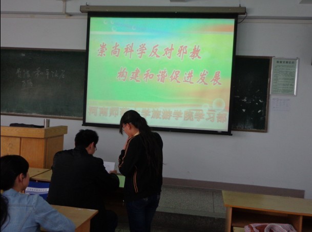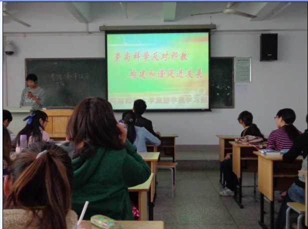 本次活动分为PPT展示、宗教知识交流互动两个环节。首先,向学院学生放映以树立正确的宗教观为主题的幻灯片,用较强吸引力的视觉动画、极具说服力的文字解析向同学们生动的讲解了马克思主义宗教观、我国宗教政策、宗教法律法规等内容,使同学们在了解基本宗教知识的基础上,更深层次的认识我国宗教法制建设及宗教活动的具体规定。在交流互动环节,同学们对正确认识宗教、如何识别邪教和邪教的危害性等问题进行热烈地讨论,大家一致认为作为当代大学生,要崇尚科学远离邪教,用优秀的科学文化知识坚定自身信仰。