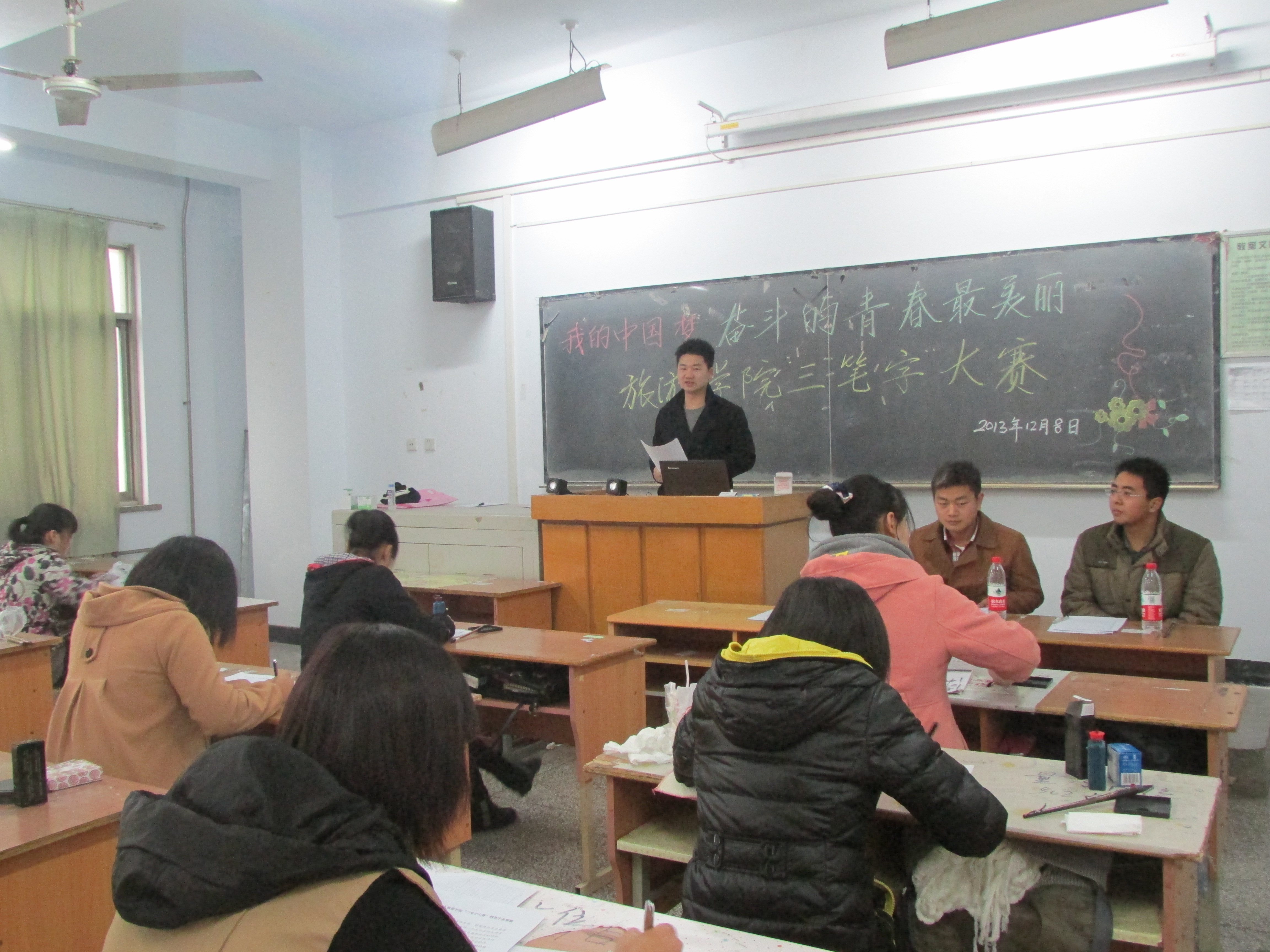 12月8日上午,由旅游学院团委宣传部主办的“三笔字”大赛在田家炳教育书院414举行。往届校级“三笔字”大赛全能奖得主徐振涛、朱帅应邀担任评委,旅游学院2012级、2013级书法爱好者参与了此次比赛。
