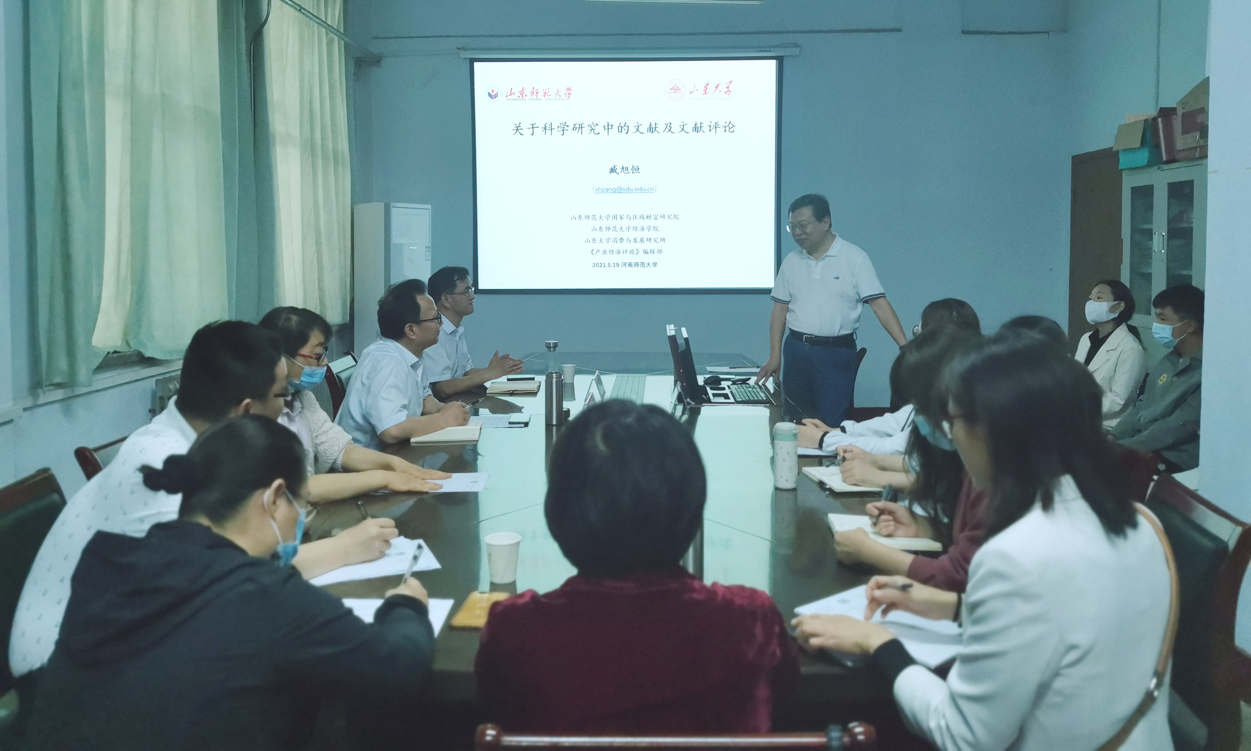 2021年5月20日上午10时,旅游学院第九届研究生学术活动月——名师名家讲座第二场开启。山东大学特聘教授、博士生导师臧旭恒应邀以《关于科学研究中的文献及文献评论》为题作专题报告,活动由院党委书记冯峰主持,院长刘英基等校内导师与在校研究生参加。