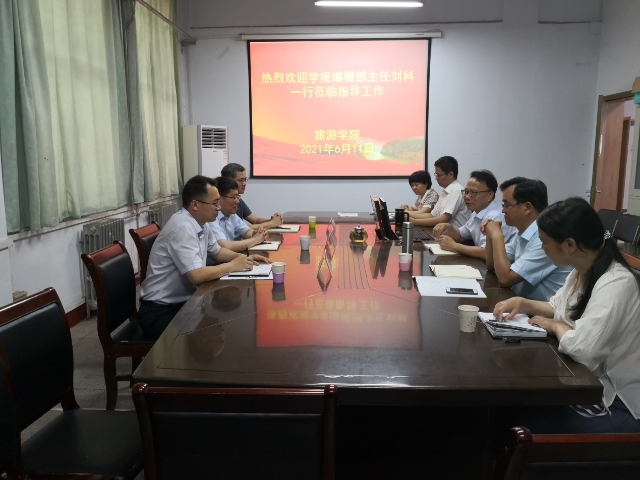 旅游学院院长刘英基向学报编辑部主任刘科一行介绍了学院面向社会需求,打造专业服务团队,以共建、共创、共生求合作,教学、科研与服务三位一体、融通发展的基本发展思路。学报编辑部副主任陈留院从“高校自然科学版学报现状”“河南师范大学学报(自然科学版)竞争力提升路径选择”和“河南师范大学学报(自然科学版)竞争力提升的办刊实践”等几个方面介绍了师大学报(自然科学版)基本情况。刘科主任对河南师范大学学报哲学社会科学版、自然科学版和教育版的各栏目做了全面介绍。