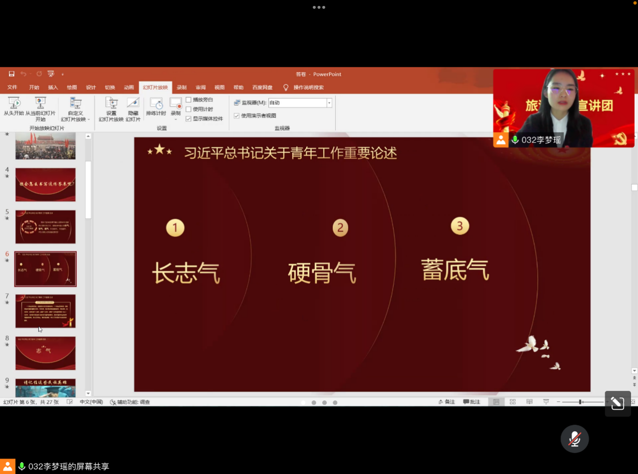 为深入学习贯彻党的二十大精神,落实习近平总书记对青年的殷切希望,11月19日旅游学院于线上举办第六期“深入学习贯彻党的二十大精神”主题宣讲会,2022级旅游管理专升本班全体成员参加此次会议。