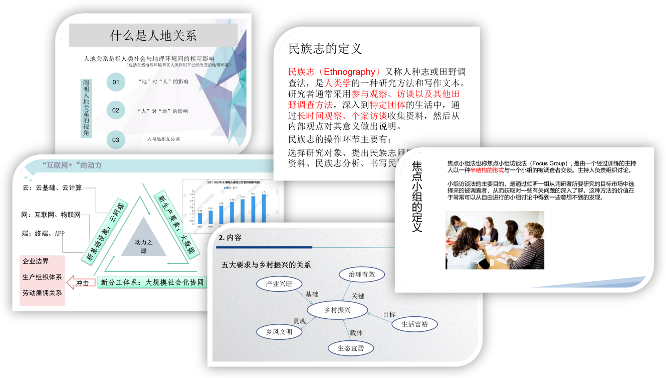 会议伊始,彭晨洋同学通过理论分析、发展阶段,实例讲解全方位展示了人地关系的主要内容;陈鑫雨同学以知识图谱可视化的方式重点通过数据分析、思维导图清晰阐释了何为乡村振兴;任芳仪同学以较强的理论讲解和特点分析让同学人深入了解了什么是“互联网+”;杨一帆同学通过理论—举例—印证理论的新颖逻辑思路引起了同学们对民族志的浓厚兴趣;刘金子同学绘声绘色却又不乏逻辑性地为同学们讲述了焦点小组的内容以及如何进行一次完整的焦点小组讨论。同学们在第一次汇报的基础上改正不足,呈现出更加精彩纷呈的汇报内容,精益求精,各具特色。