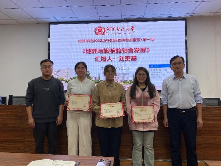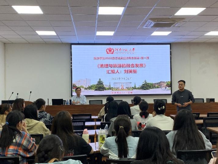 报告伊始,刘迪老师及同学们热情欢迎刘英基院长的到来,之后刘英基就地理、旅游、规划三个不同的方面展开论述。既立足三个专业本身内容特点,又阐述我院本科专业的侧重点,之后通过把握三者之间的联系,表明人文地理-旅游规划所体现的新颖的研究思路、研究方向,突显学科间交叉融合的重大意义。接着,刘迪老师对刘英基院长的报告内容进行回顾、和总结。最后,班级对上学期学习分享会中表现优异的张琳函、李晓玉、陈鑫雨同学进行表彰。通过此次专题报告会,同学们收获颇丰,受益匪浅,对地理学与旅游学的融通发展理念有了更加深刻的理解,对学科交叉方法有了较为全面的认识。