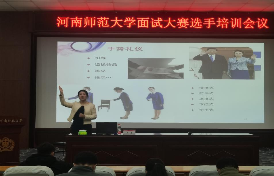 为帮助我校学生熟知求职面试流程,提高学生面试礼仪技能,培养学生自信心,11月28号下午,由招生就业处主办、旅游学院承办的河南师范大学“面向未来,驰骋职场”求职面试大赛选手礼仪培训讲座于物理北楼报告厅举办,旅游学院酒店管理系主任王晶老师担任本次礼仪讲座的主讲人,来自各学院的65名选手、学生代表共计300余人到场参加。