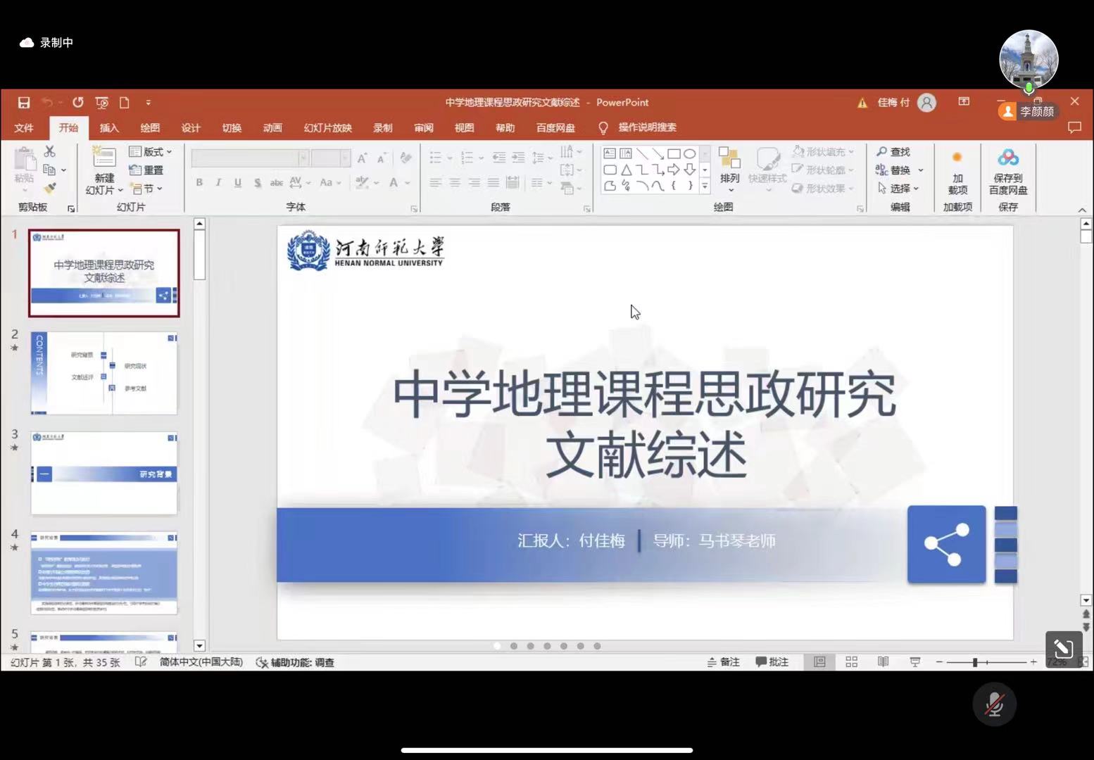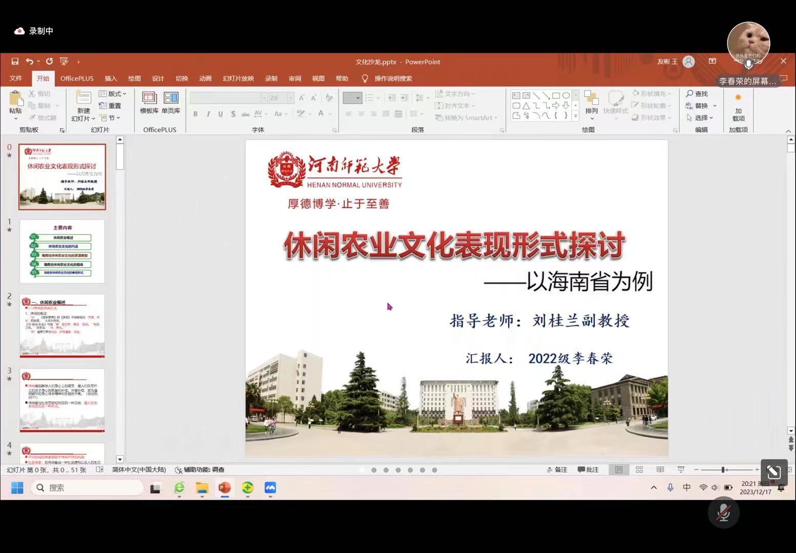 首先,付佳梅同学以《中学地理课程思政研究文献综述》为题进行了汇报,她梳理了地理课程思政相关的研究内容和教学过程,从如何进行案例分析、教学实践和教师培养等方面进行探讨,揭示了当前我国地理课程思政的育人格局,分析了未来地理课程思政可能的研究方向,期待地理课程思政的优秀实践成果不断涌现。随后,李春荣同学作了题为《休闲农业文化表现形式探讨——以海南省为例》的报告,她以海南省为例,从休闲农业文化的内涵、资源类型、农业文化载体和表现形式四个模块进行了详细阐述和拓展,并提出了政策建议,一是要加强农业文化教育,大力发展乡村文化旅游;二是要抓住重点,打造特色;三是要加强协会内部的联合,在相互取长补短、资源利用上合作。