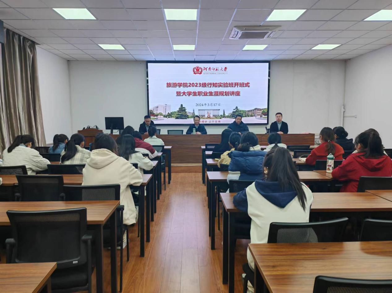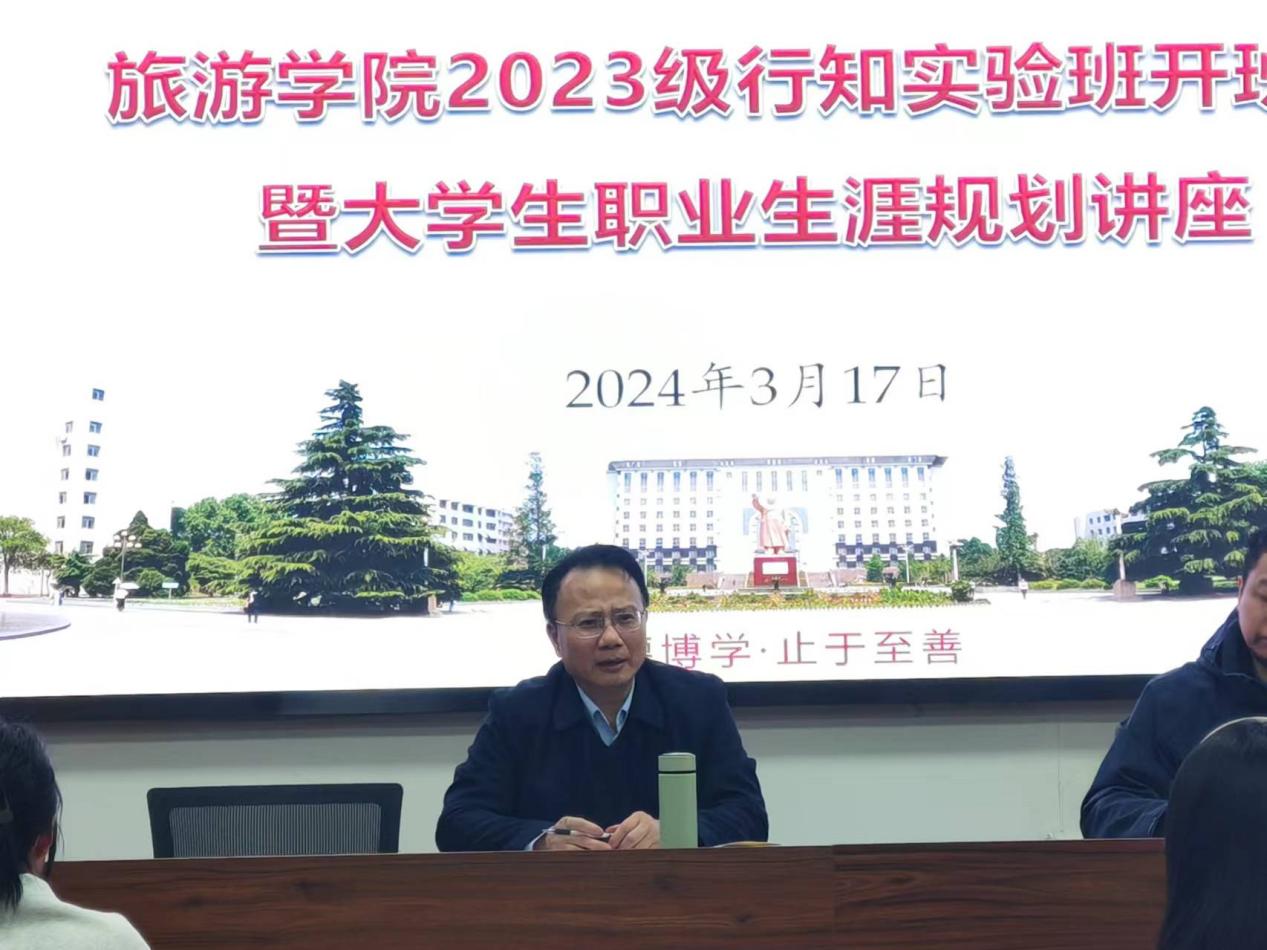 3月17日19:30,旅游学院在行知大讲堂举办了2023级行知实验班开班式暨大学生职业生涯规划讲座。旅游学院党委书记冯峰、副院长付强、2022级班主任刘迪、2023级班主任朱鹏、2022级实验班班长陈鑫雨及2023级行知实验班34名同学参加了此次活动。活动由朱鹏老师主持。