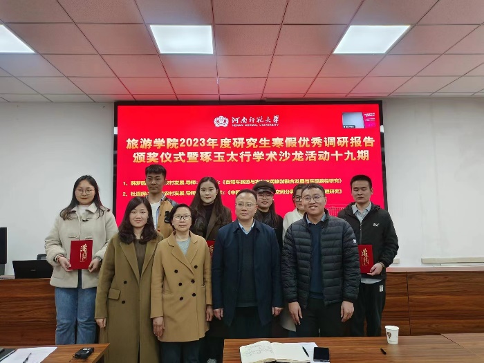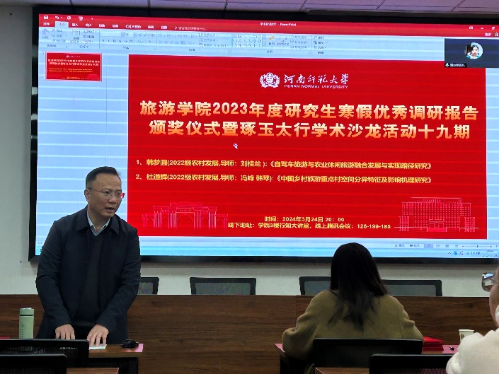 3月24日晚,旅游学院在行知大讲堂举行2023年度研究生寒假优秀调研报告颁奖仪式暨“琢玉太行”第十九期研究生学术沙龙活动,线上同步推进,旅游学院党委书记冯峰、副院长王二红、刘桂兰等老师与全体研究生参加,本次活动由研究生秘书李颜颜主持。