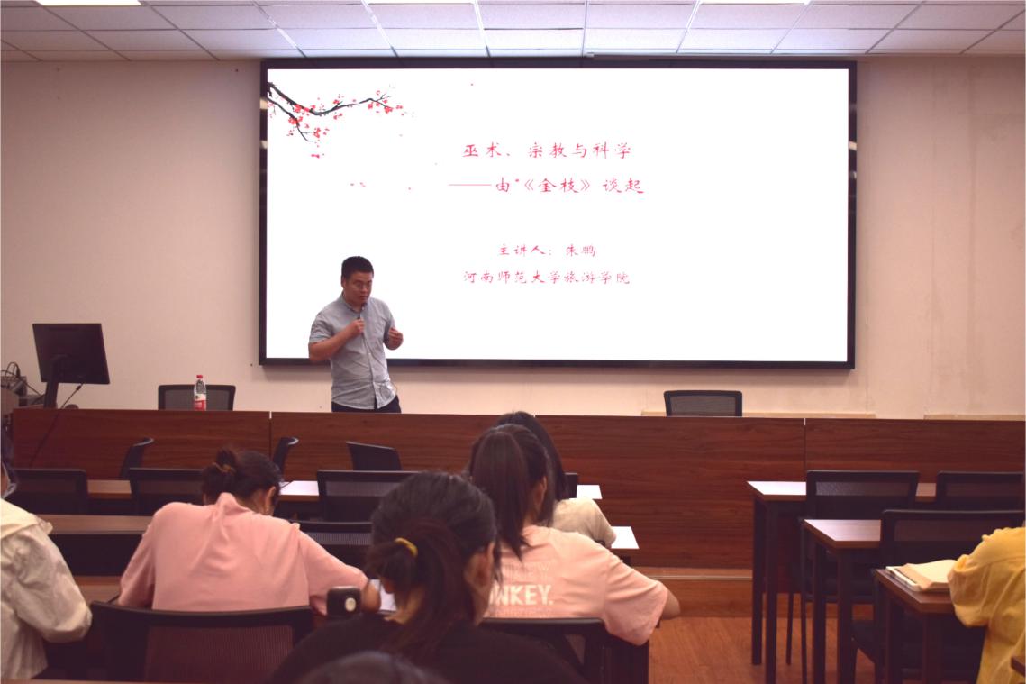 朱鹏首先向同学们介绍了《金枝》这部研究巫术与原始习俗的经典之作,并详细解释了书名“金枝”的寓意。随后,他借助视频资料,生动形象地阐述了巫术作为一种被扭曲的自然规律体系的特点。他指出,巫术是一种被歪曲了的自然规律的体系,也是一套谬误的指导行动准则;它是一种伪科学,也是没有成就的技艺。在讲座中,朱鹏讲师重点介绍了《金枝》中的“交感巫术理论”,并通过生动的案例和故事,使同学们对该理论的两个思想原则——相似率和接触率有了更加深入地理解。他强调,《金枝》不仅揭示了古代文化的奥秘,更对我们现代生活具有深刻的启示作用。