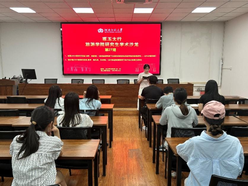 首先,赵丽同学以《绿色发展背景下古镇休闲旅游生态效率印象因素研究——以G小镇为例》为题展开汇报,研究以G小镇为例,建立了以生态足迹为基础的旅游生态效益模型,对G小镇旅游产业可持续发展现状进行实证研究,并对相关问题进行实证分析,以期为G小镇的旅游高质量发展,以及我国其它同类旅游目的地的发展提供借鉴。随后,杨小梅同学以《乡村旅游发展背景下农户生计恢复力研究》为题展开汇报,综合运用实地访谈法、均方差决策法、对比分析法、障碍度模型进行研究,在此基础上,构建乡村旅游地农户生计恢复力评价指标体系,以期为提升农户生计弹性,保障农户生计安全,实现乡村振兴提供科学依据。