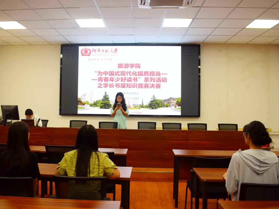 为引导我校学生学习中国共产党的发展历史、传承红色基因,彰显新时代大学生的使命担当,5月25日和6月1日,旅游学院在琢玉楼行知大讲堂分别举办“为中国式现代化挺膺担当——青春年少好读书”系列活动之学长书屋知识竞赛初赛和决赛活动。本次活动的主题为“学习党的创新理论,感悟党的光辉历史”,竞赛内容围绕《中国共产党简史》展开。