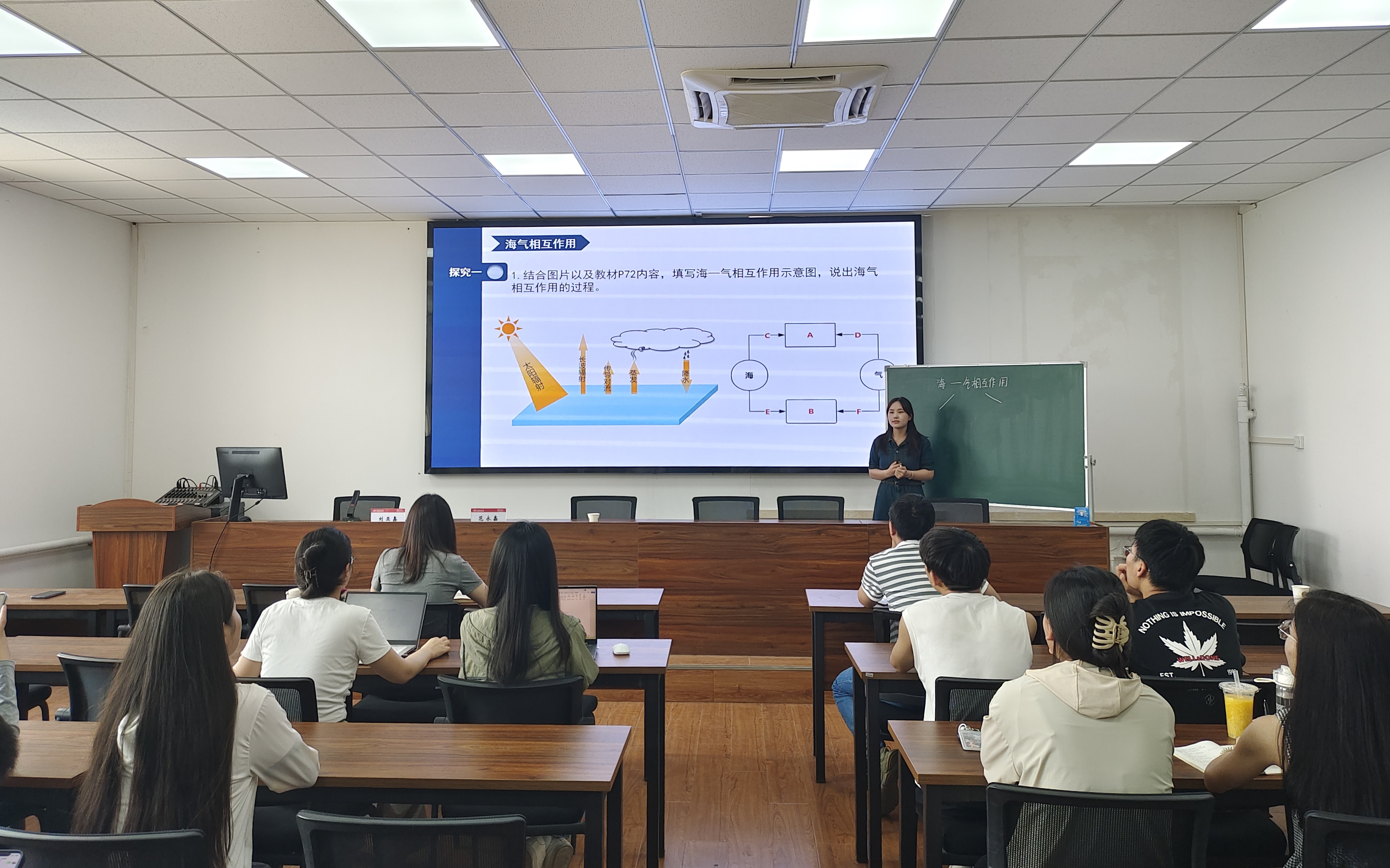会议伊始,李颜颜老师对两位学生的到来表示热烈欢迎,并向参会学生介绍了两位特邀学生在教学技能比赛中取得的优异成绩。刘亚鑫同学以《海——气相互作用》为题进行现场教学展示,从导入、教学目标、教学过程,小结与作业、板书等环节进行演示,教态自然,内容衔接紧密,教学节奏把握有度,语言生动形象,为师弟师妹进行了良好的示范。随后,范永鑫同学根据自己参加田家炳杯的经验进行分享,从选题、封面与目录、设计理念、教材分析、教学目标、学情分析、教学思路、教学环节等模块进行了详细的讲解,并结合大量案例和以往参赛选手的优秀作品具体分析了在教学设计中应注意的内容,极大的丰富了我院学生的知识储备。与此同时,在分享案例的过程中,范永鑫还强调了教学语态的重要性,鼓励同学们发挥自己的优势,找对适合自己教学风格,能够取得事半功倍的效果。