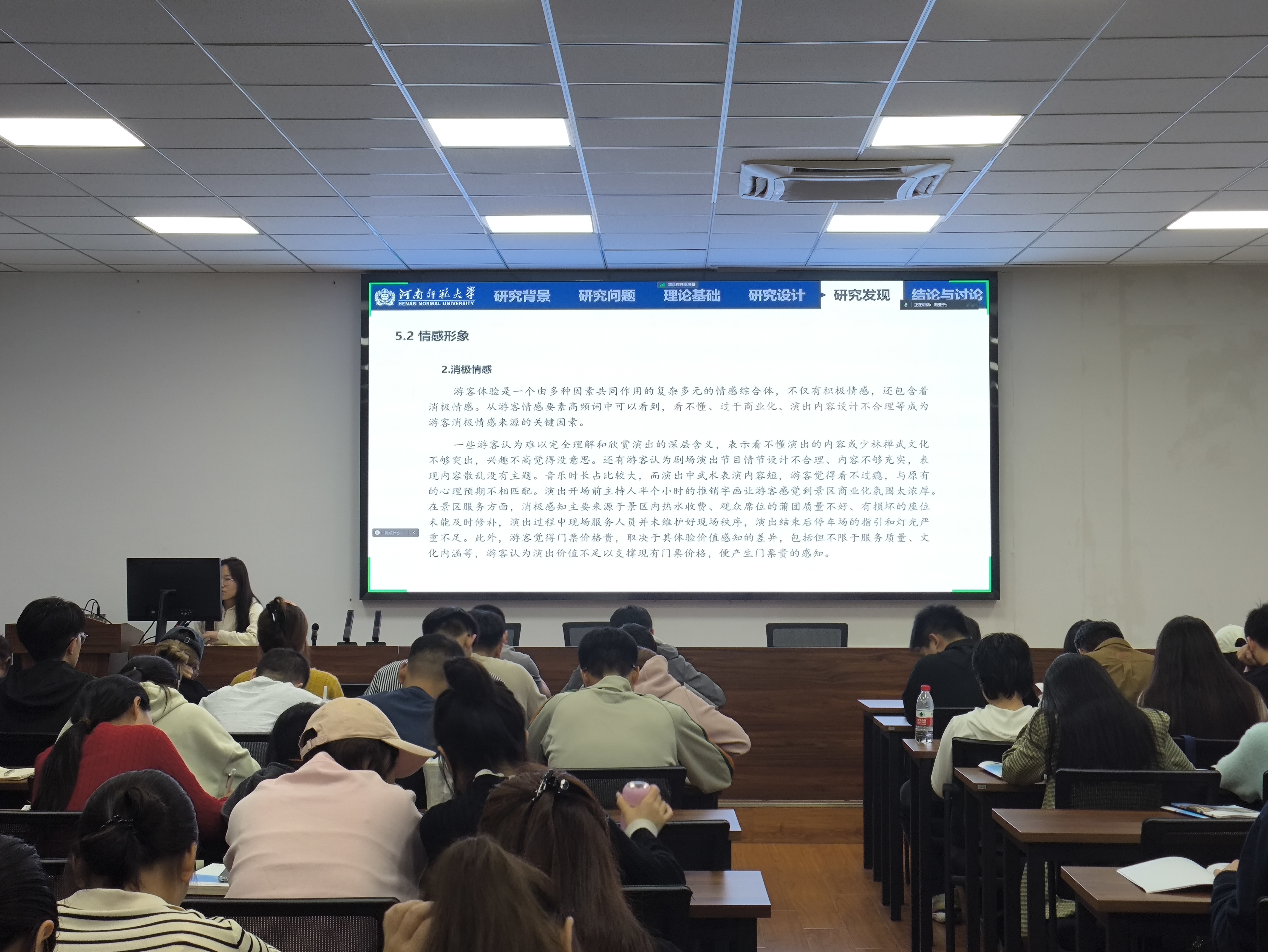 首先,邱丽苹同学以《禅宗少林·音乐大典实景演出的少林禅武文化形象感知研究》为题进行汇报,采用了多种研究方法,包括文献综述、实地考察、观众访谈等,以确保研究结果的全面性和准确性。她发现,观众对于《禅宗少林·音乐大典》的感知主要集中在以下几个方面:首先,演出成功地将少林禅武文化的核心价值——“禅武合一”进行了生动的诠释;其次,通过现代舞台技术和艺术表现手法,演出使得传统文化更加贴近现代观众的审美需求;最后,演出的互动性和参与感让观众在体验中更加深刻地理解和感受到了少林文化的魅力。