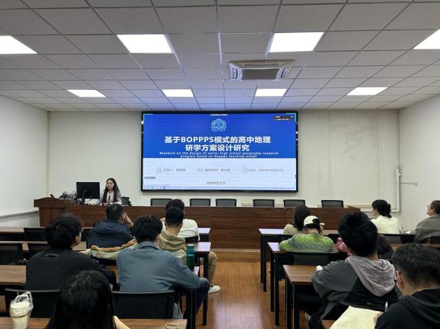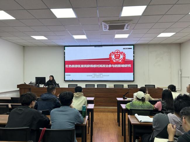 首先,穆雨晴同学以《基于BOPPPS模式的高中地理研学方案设计研究》为题展开汇报,通过建构主义学习理论、人本主义学习理论、多元智能理论以及生活教育等理论,详细探讨了如何将BOPPPS教学模式应用于高中地理研学活动中,旨在提升学生的学习积极性和课堂参与度,进一步优化高中地理教学效果。随后,卞雯慧同学汇报了《红色旅游区居民获得感对其政治参与的影响研究》的研究内容,该同学通过参考其他学者调查问卷,对26个红色旅游省居民进行问卷研究分析,并以此为基础将获得感、认同、政治参与三个变量构建为研究模型。生动诠释了红色旅游区居民获得感与政治参与之间的复杂关系,为红色旅游区的社会治理与居民参与的研究提供了新的启发。