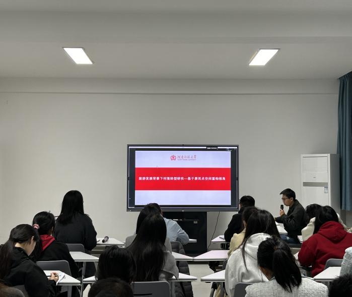 首先,牛凯源同学以《黄河险工地理研学资源开发与案例设计》为题,深入探讨了研学旅行所具有的亲身体验性、实践性和研究性等特性。与传统的教育模式相比,研学旅行在理论上被寄予厚望,认为它能更好地促进学生的全面发展,并增强他们的地理实践能力。牛凯源的文章通过曹岗险工的具体案例进行研学设计,运用具身认知理论作为研学活动设计的指导模型,其设计的整体思路、主题设定以及情景任务不仅适用于黄河险工水利景观的地理研学活动,也有助于拥有类似自然资源的地区进行本地化的资源开发与设计。紧接着,丁启珅同学以《旅游发展背景下村落转型研究——基于居民点空间重构视角》为主题进行了报告。他从居民点空间系统的重构角度出发,选取典型的旅游村落作为研究对象,探讨了居民点空间系统重构的过程。丁启珅指出,村落居民点不仅是乡村地域功能中农业生产和农民生活的地理空间载体,也是农村生态环境的组成部分,是自然与人文因素交织的综合体,具有内在和外在的双重特性。他强调,乡村的空间重构是推动乡村振兴的关键手段之一。随着乡村旅游成为实现乡村振兴的重要途径和突破点,这一领域也成为了旅游学界关注的焦点。