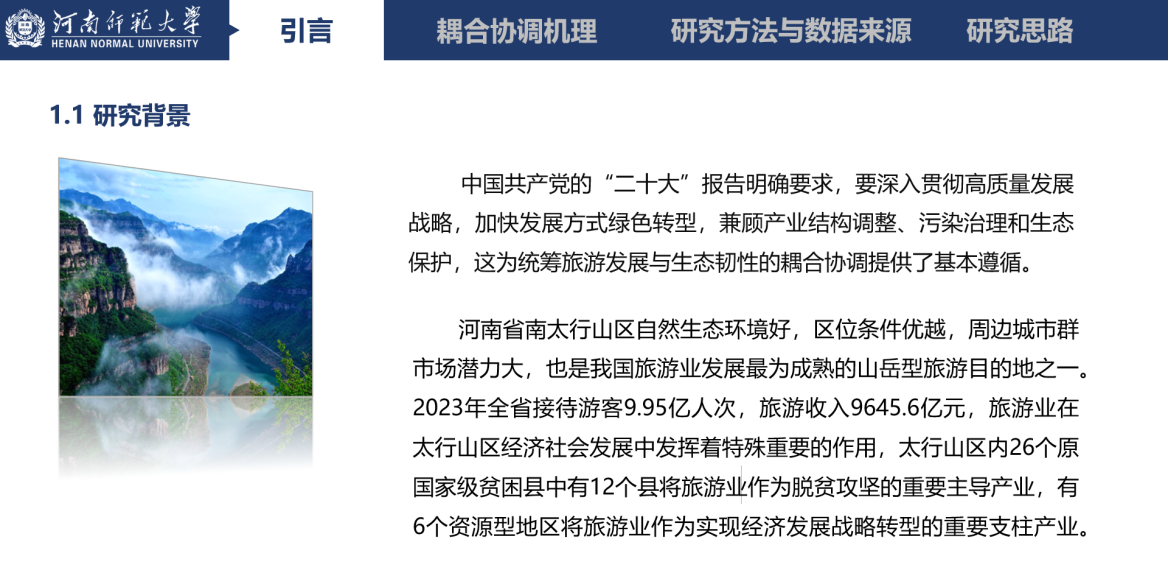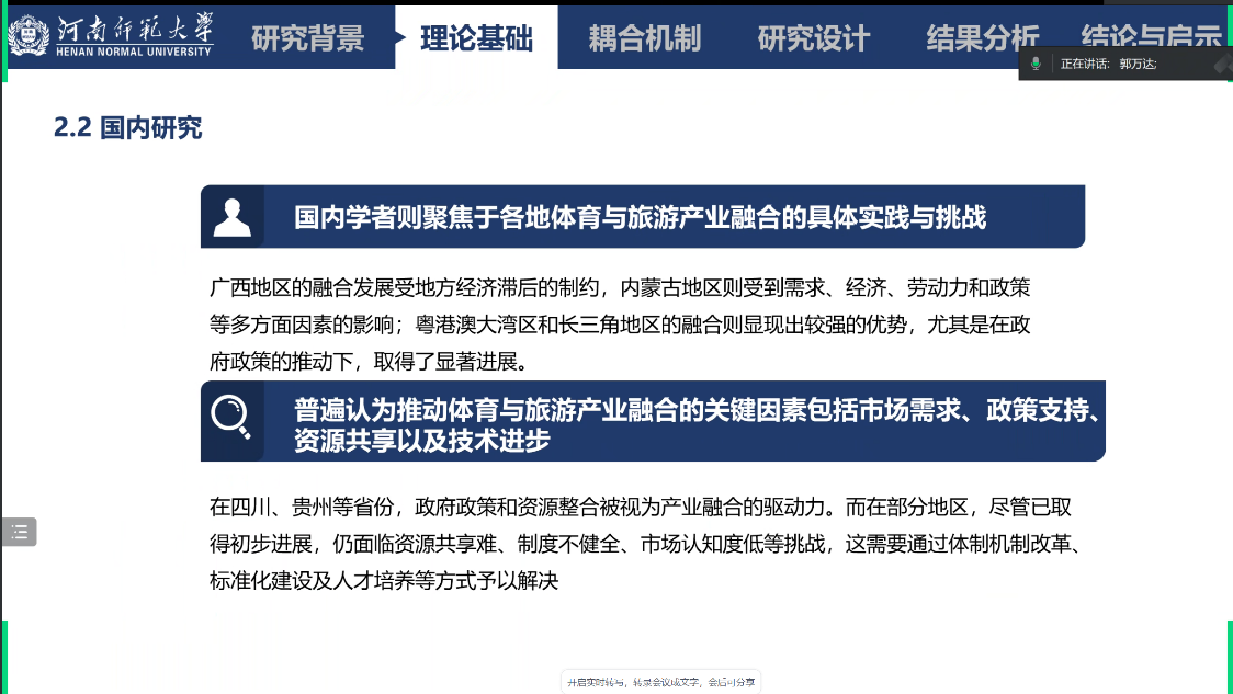 首先,王思萌同学汇报了题为《河南省南太行地区旅游发展与生态韧性耦合协调关系》的报告。她详细介绍了河南省南太行地区的旅游发展现状以及与生态韧性的耦合协调关系,探讨了旅游发展与生态保护之间的平衡问题。她通过对河南省南太行地区旅游发展与生态韧性耦合协调关系的研究,发现两者之间的关系具有较大的协同发展空间。通过制定合理的政策和措施,可以进一步促进旅游发展和生态保护的协同发展,为河南省南太行地区的可持续发展做出贡献。随后,郭万达同学汇报了题为《中国体育产业与旅游产业的耦合协调度研究》的报告。他深入分析了我国体育产业与旅游产业的耦合协调度,提出了促进两者协同发展的策略和建议。他通过对中国体育产业与旅游产业耦合协调度的研究,发现两者之间存在密切的互动关系。通过制定合理的政策和措施,可以进一步促进体育产业与旅游产业的协同发展,为国民经济的持续增长做出贡献。