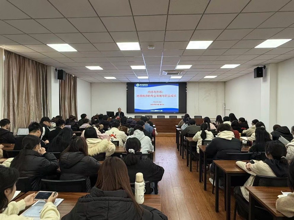 首先,王二红对程金龙教授的到来表示热烈欢迎,并向与会师生简要介绍了程金龙教授的学术成就。随后,程金龙教授凭借其丰富的教育经验和深刻的行业洞察,为在场师生提供了一场思想的盛宴。程金龙教授在讲座中强调,地理教师不仅要注重内在的知识积累和教学技能的提升,即“内修”,还要重视外在的实践经验和职业素养的培养,即“外练”。他鼓励教师们积极参与教育实践,不断反思和总结,以实现个人职业生涯的持续成长和发展。讲座内容涵盖了地理教师专业发展的多个方面,包括教学技能的提升、学科知识的深化、教育科研能力的培养以及职业素养的塑造等。