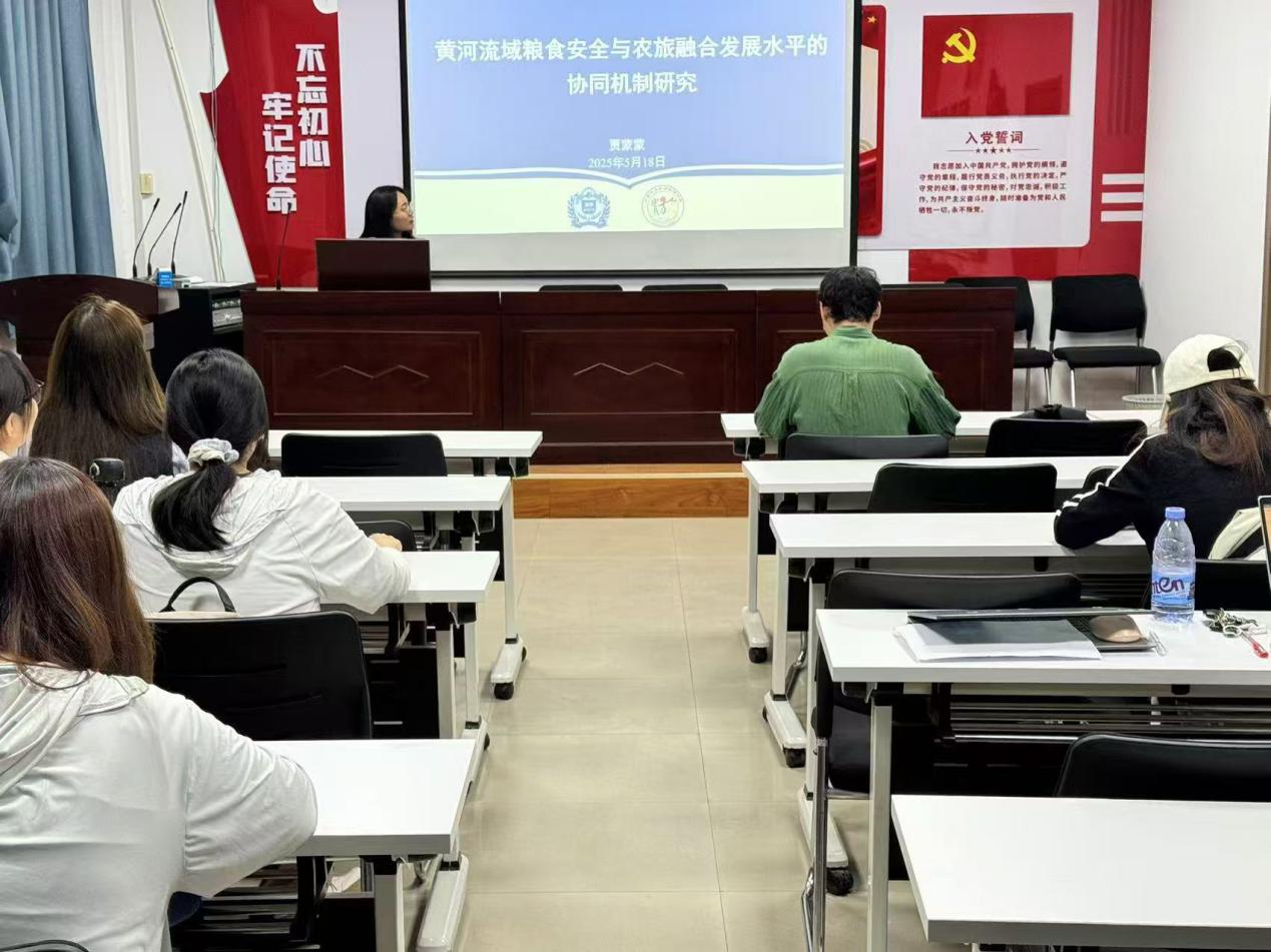 贾蒙蒙从研究背景和意义、当前研究进展、研究区概况、结果分析和结论与展望五个方面对“黄河流域粮食安全与农旅融合发展水平的协同机制研究”专题展开了报告。首先,贾蒙蒙从国家战略需求切入,强调黄河流域作为“中国粮仓”的重要性。河南省以全国6%耕地贡献10%粮食产量,但面临极端气候、劳动力流失、土地碎片化等问题。国际局势动荡(如俄乌冲突导致全球粮食供应链波动)及国内农业收益偏低,进一步加剧粮食安全风险。贾蒙蒙聚焦粮食安全与农旅融合的协同关系与政策优化路径两大核心来探索通过农旅融合缓解粮食安全压力的可行性。接着贾蒙蒙指出采用协整检验与脉冲响应模型,可以揭示双向动态关系,从而更好地应对极端气候、产量波动对乡村旅游造成的影响。最后贾蒙蒙指出要以“稳粮优先、协同增效”为宗旨,强化粮食生产基础、优化农旅融合模式、深化区域差异化研究。粮食安全是农旅融合的前提保障,而二者的良性互动需依靠技术创新与政策精准调控。贾蒙蒙指出下一步将聚焦县域尺度,结合实地调研构建动态评估体系,为黄河流域农业与旅游协同发展提供更精细化支撑。