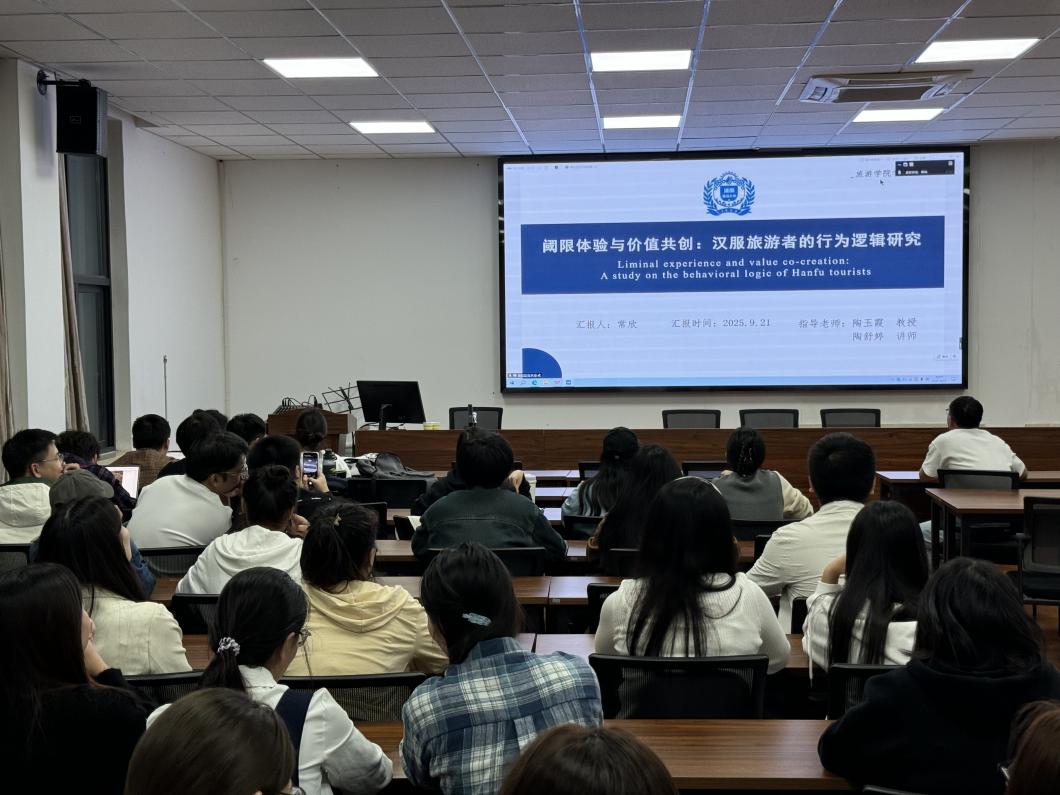 沙龙伊始,常欣同学以《阈限体验与价值共创:汉服旅游者的行为逻辑研究》为题展开汇报。她从当前汉服旅游兴起的社会背景切入,指出汉服旅游作为文化旅游的重要细分领域,其背后蕴含着游客独特的体验需求与价值创造过程。汇报中,常欣同学详细阐述了 “阈限体验” 理论在汉服旅游场景中的应用,通过实证研究分析了汉服旅游者在体验过程中的心理变化、行为特征,以及游客与景区、同好之间的价值共创机制,并展示了研究过程中采用的问卷调查、深度访谈等研究方法与核心数据成果。随后,贾宇飞同学带来《文旅微短剧叙事属性对乡村旅游游客出游意愿影响研究》的汇报。她结合当下文旅微短剧成为乡村旅游宣传新载体的趋势,聚焦文旅微短剧的叙事属性,深入探讨其对游客出游意愿的影响路径。通过构建理论模型,分析了叙事主题、叙事视角、情感表达等维度对游客感知价值、出游意愿的具体影响,并结合典型案例佐证研究结论。
