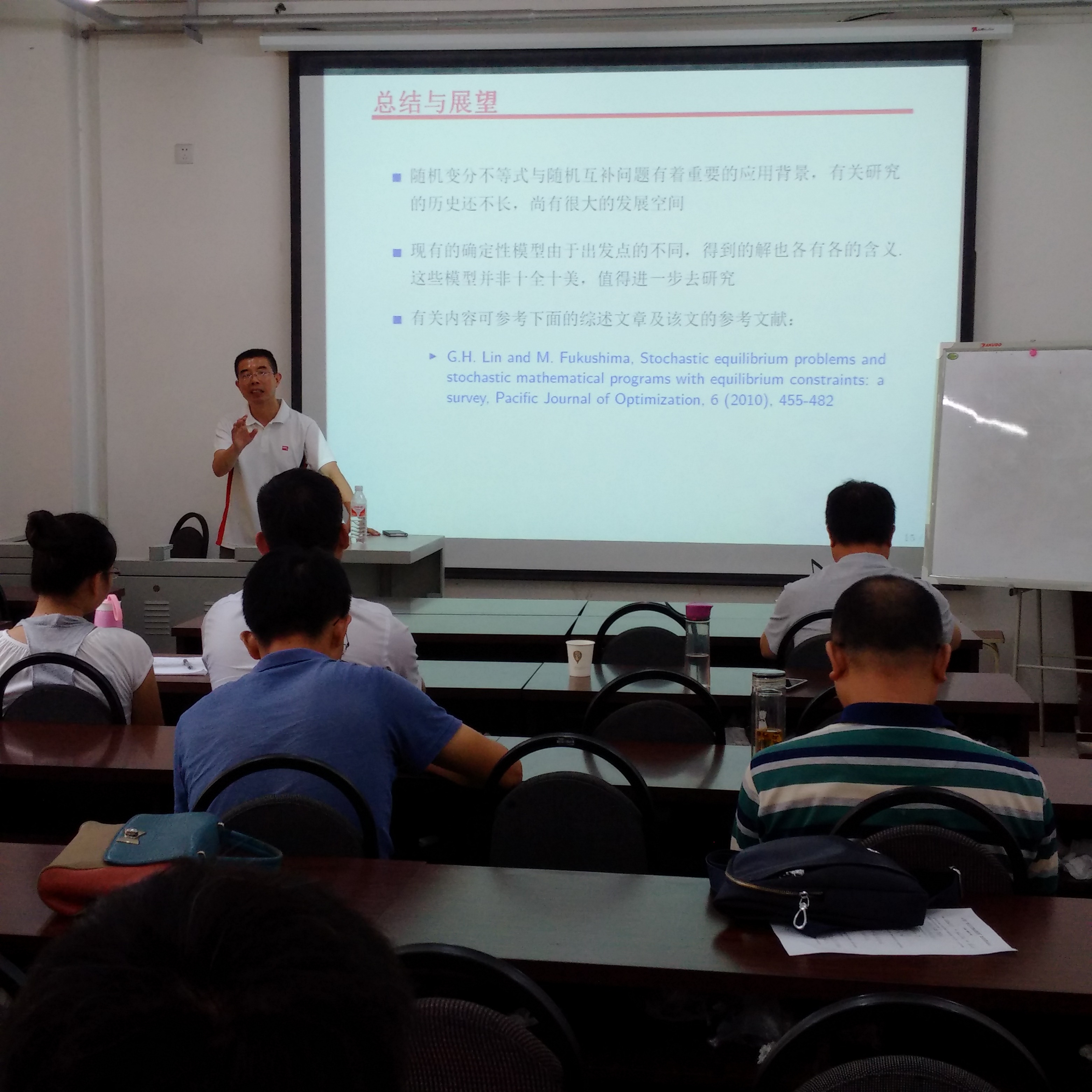 林贵华教授以变分不等式与互补问题开题,以其在交通规划、经济平衡、最优控制、以及对策理论等众多领域的应用为基础,举例介绍了变分不等式与互补问题在双人非合作博弈、供应链网络均衡的应用。介绍了变分不等式与互补理论的历史与现状,变分不等式与互补理论在日趋完善的同时也面临着越来越多的新挑战。由于现实世界中很多问题会涉及随机因素,漠视这些随机因素有可能会导致决策失误,因此有必要带有随机变量的变分不等式与互补问题。林贵华教授接着介绍了有关随机变分不等式与随机互补问题的一些最新进展,包括求解随机变分不等式与互不问题的期望(EV)模型、期望残差极小化(ERM)模型、随机MPEC模型和基于风险度量的CVaR模型。报告结束后,林贵华教授和与会师生进行了交流互动,现场气氛异常活跃。