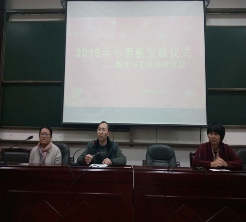学高为师,身正为范,为提高师范生的教学素养及教师技能,11月16日,数学与信息科学学院于院多功能报告厅举行2016年黑板发放仪式。院党委副书记李富杰、团委副书记吴小林兼2014级辅导员出席本次活动,办公室副主任兼2016级辅导员杜亚璇主持此次发放仪式。我院2016级部分学生积极参与本次活动。
