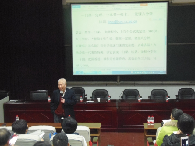第二阶段的会议由河南数学教育研究会副理事长王红蔚教授主持。中国科学院林群院士做了“一门课一定理,一堂课八分钟,可能吗?”的报告。报告会上,林群院士用诙谐幽默的语言以微积分教育为例,对曲线的直线化处理导出概念和定理作了详细分析,将抽象的概念直观化和形象化。提出将微积分变到一个圆,把圆看透,微积分也就能看透,高效的学习方法:只要八分钟。报告给大家深入理解数学及数学教学带来了很多启示。