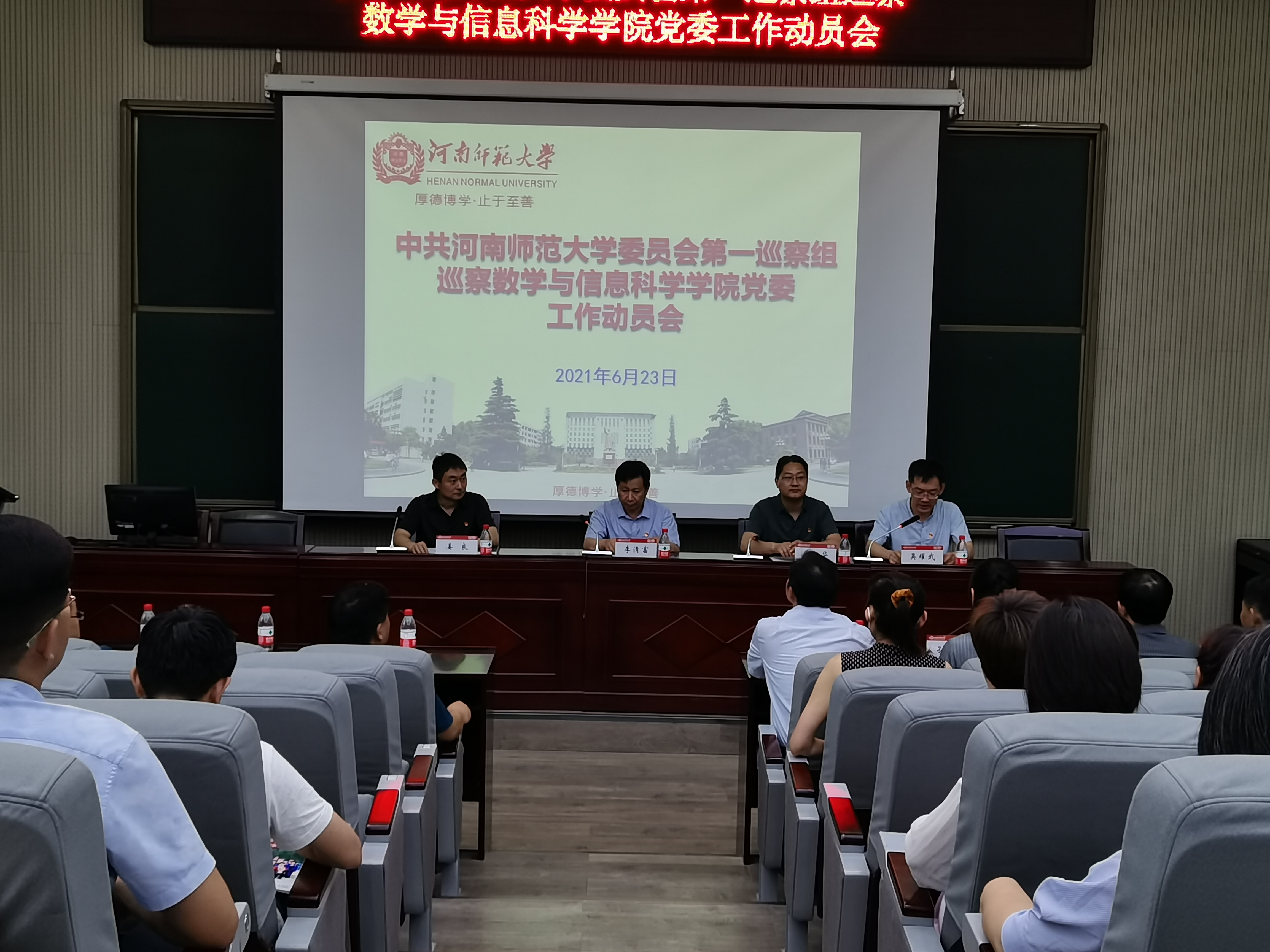 为贯彻落实中央、省委关于巡察工作的新要求新部署,推动全面从严治党向基层延伸,加强对基层党组织和党员干部的监督检查,根据《中共河南师范大学第十二届委员会第一轮巡察工作实施方案》安排,党委第一巡察组对数学与信息科学学院党委开展常规巡察工作。6月23日下午,党委第一巡察组召开动员会。巡察工作领导小组成员、巡察办工作人员、第一巡察组全体成员、数学与信息科学学院领导班子成员、全体教职工、学生代表等参会。会议由党委副书记吴耀武同志主持。