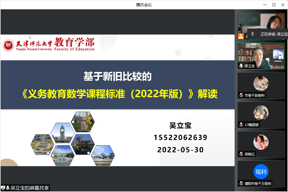 5月30日下午,天津师范大学吴立宝教授的讲座《义务教育数学课程标准(2022版)》主要内容和变化。吴教授主要讲解了义务教育数学课程标准的修订背景、编排结构、课程性质与理念、课程目标、课程内容、学业质量及课程实施。