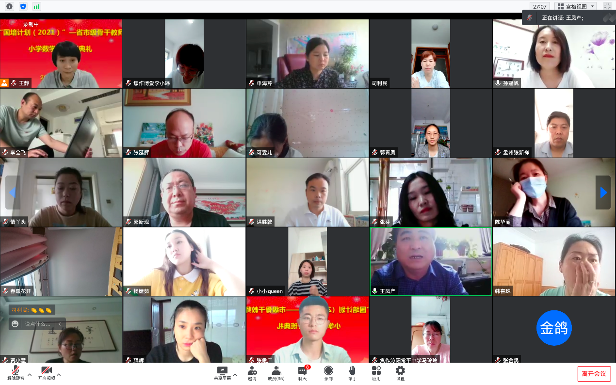 2022年5月22日上午,“国培计划(2021)”——市级骨干教师培训小学数学班在我校隆重开班。全体学员在腾讯会议上举行了开班典礼。数学与信息科学学院副院长王凤产参加了开班典礼并致欢迎词,杜红霞老师作为教师代表进行了发言。