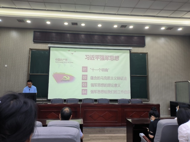 会上,裴永刚同志领学习近平强军思想,强军思想理论主题为:强军兴军,理论精髓为:求是求实,共从以下四个方面进行介绍:“十一个明确”、蕴含的马克思主义辩证法、强军思想的理论意义、强军思想给我们的工作启示。