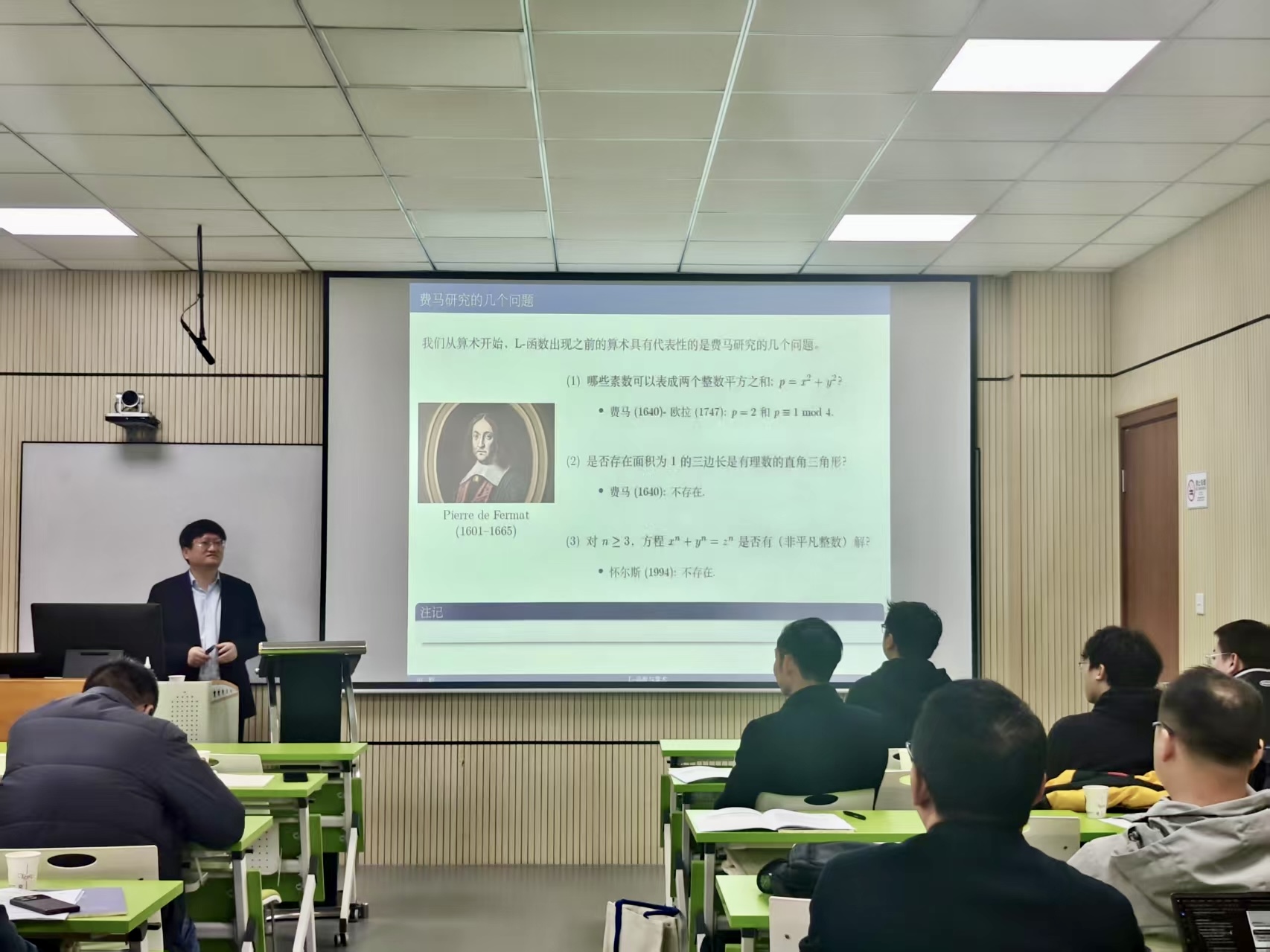 田野院士在本次报告中深入探讨了L-函数在数论中的重要性及其与算术问题的紧密联系。他从费马研究的几个经典问题入手,详细介绍了L-函数在解决这些问题中的应用。报告中,田野院士还回顾了欧拉和黎曼在L-函数研究中的贡献,他进一步介绍了现代数学家在L-函数研究中的最新进展,包括Wiles等人对椭圆曲线L-函数的模性定理的证明及其在费马大定理中的应用。本次报告不仅加深了与会者对L-函数的理解,也为未来的研究提供了新的思路和方向。