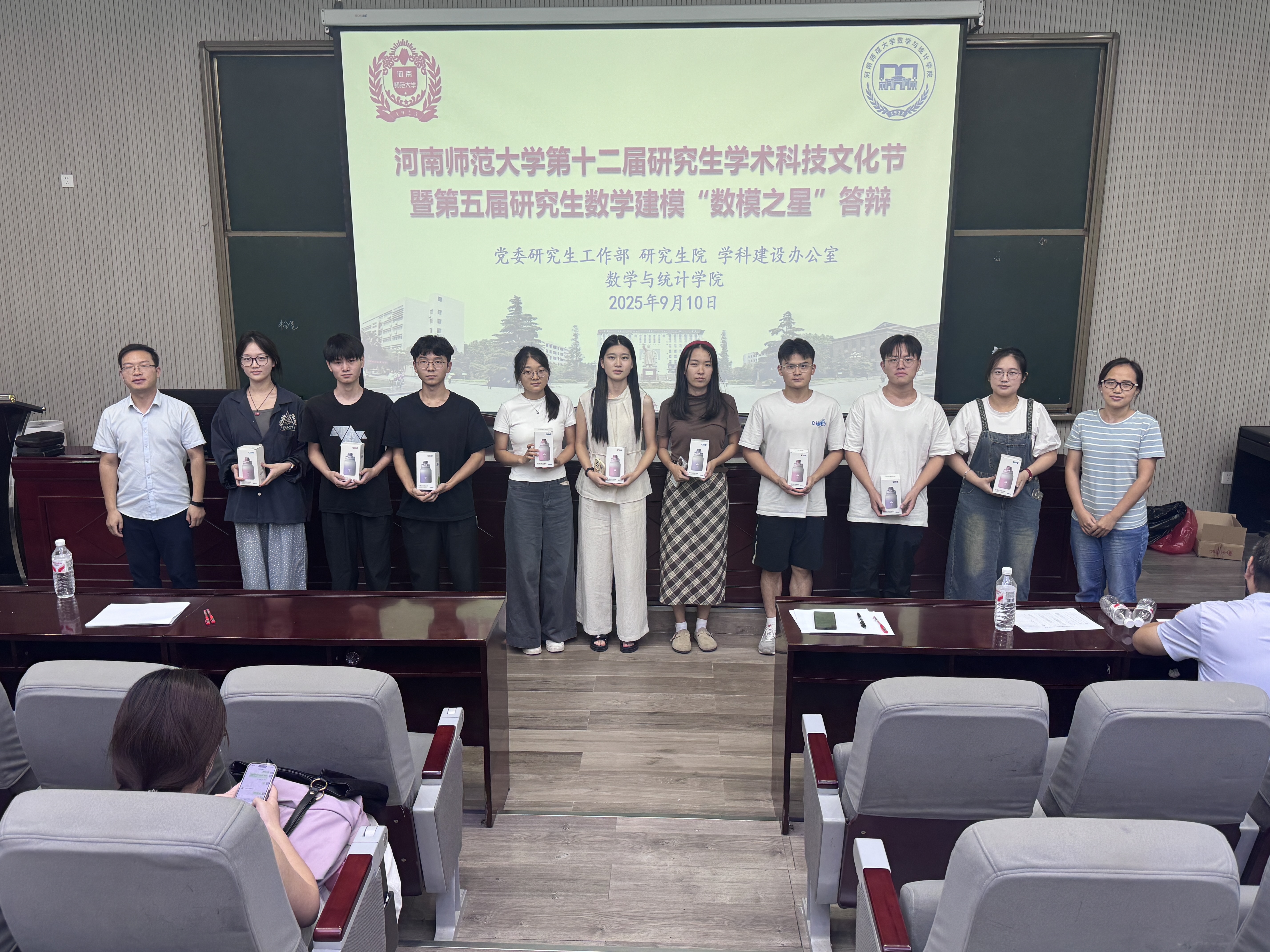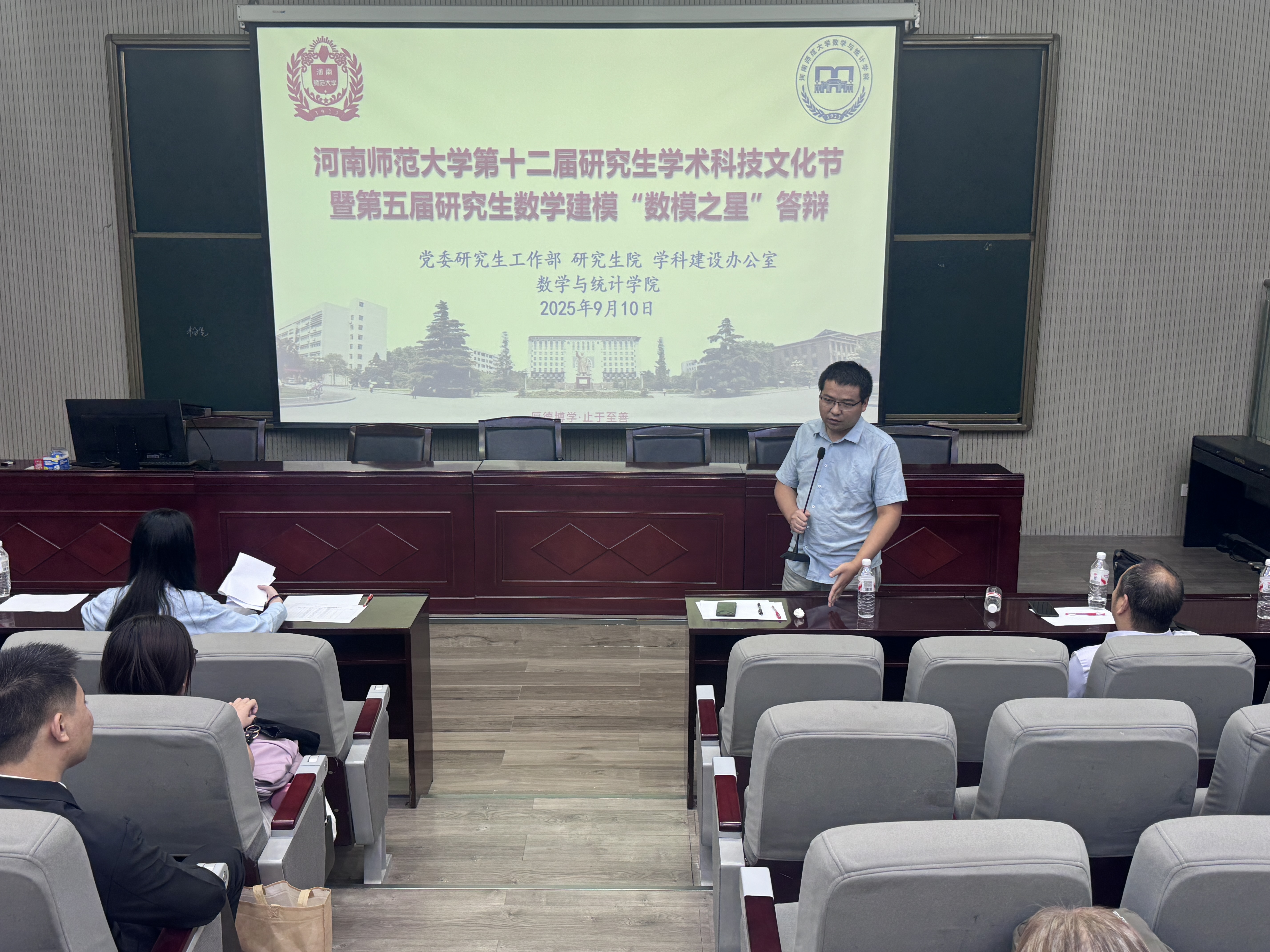9月10日晚上,由党委研究生工作部、研究生院、学科建设办公室主办,数学与统计学院承办的“河南师范大学第十二届研究生学术科技文化节暨第五届研究生数学建模竞赛数模之星答辩会”在数学院报告厅举行。天津大学黄正海教授、研究生数学建模培训教师代表、数模之星答辩成员以及数学建模参赛队员参加此次答辩会。会议采取线上线下相结合的形式,由数学与统计学院马迎宾副院长主持。
