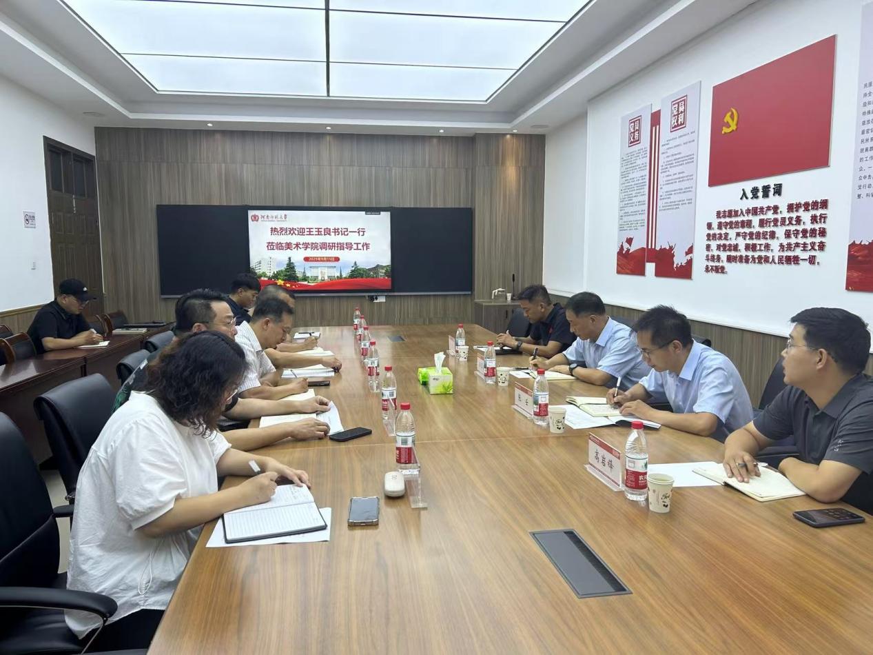 9月15日下午,校党委副书记王玉良一行莅临美术学院调研指导工作,围绕新学期开学筹备、教学科研推进、学科建设发展及人才培养提质等核心工作,为学院新学期实现高质量发展精准谋划、赋能增效。学院全体领导班子参加会议。会议由院党委书记华锋主持。院长陈巍就新学期重点工作推进情况作详细汇报。在开学筹备方面,已完成学生返校报到情况,同步抓好教学场地卫生保障与教学设备调试两项重点任务,为新学期开学秩序平稳奠定坚实基础。在学生工作开展上,聚焦新生入学适应、学业帮扶、就业及考研指导关键环节,制定“一生一策”个性化服务计划,切实筑牢学生成长发展保障体系。华锋强调,新学期要以党建为引领,将作风建设与中心工作深度融合。需强化班子成员及支部书记的责任担当,推动党建工作与教学科研、学生管理同频共振。同时要密切关注师生急难愁盼问题,健全沟通反馈机制,凝聚全院上下合力,为院校高质量发展提供坚强政治保障。在认真听取汇报后,王玉良书记对美术学院新学期筹备工作的系统性与实效性予以充分肯定。他指出,美术学院作为学校美育工作的核心载体,需始终坚守“以美育人、以文化人”工作主线,深入贯彻落实立德树人根本任务,培养具有家国情怀的新时代